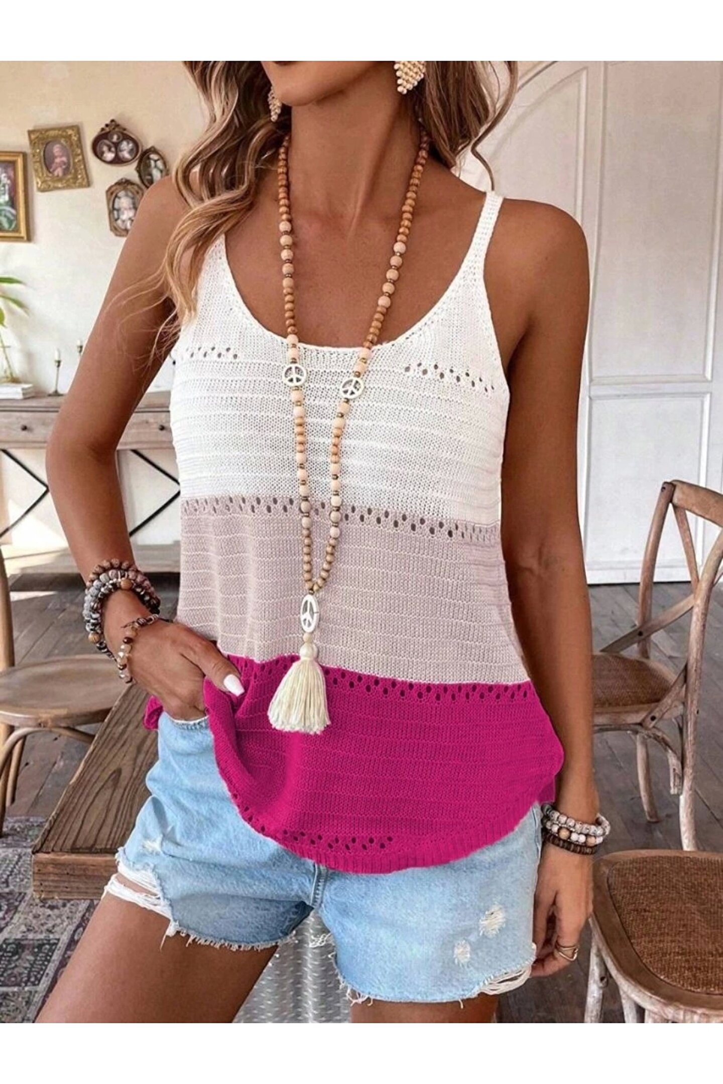 Kadın Askılı Yuvarlak Yaka çift Renkli Triko Bluz