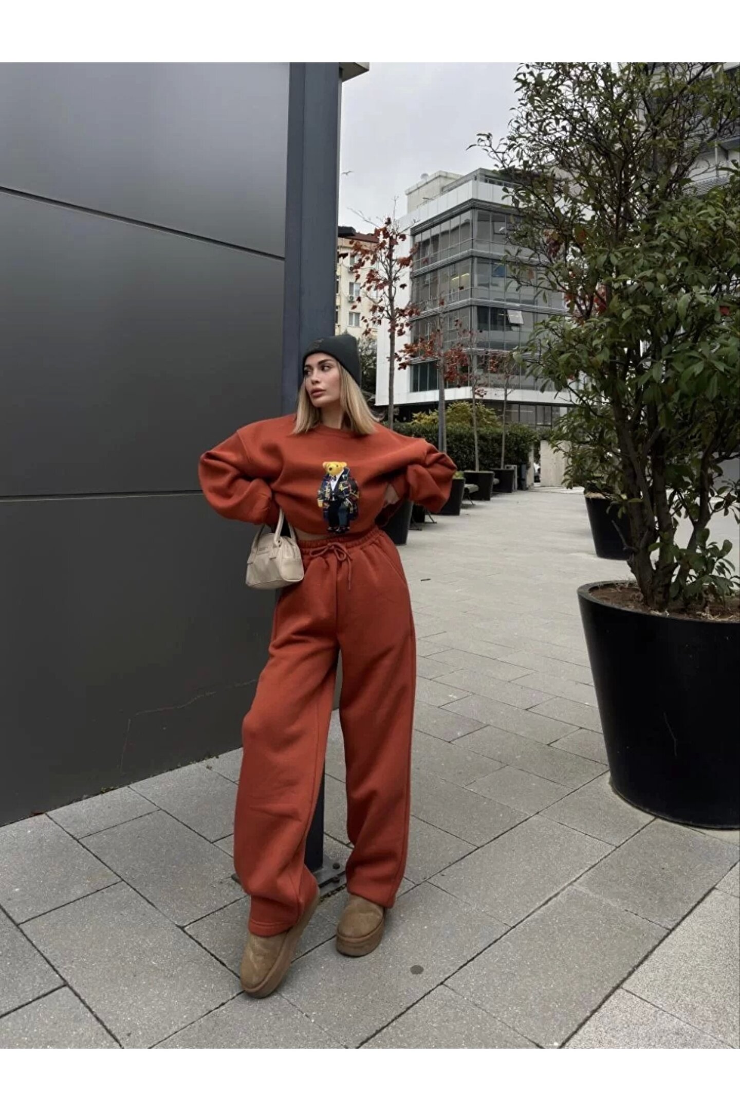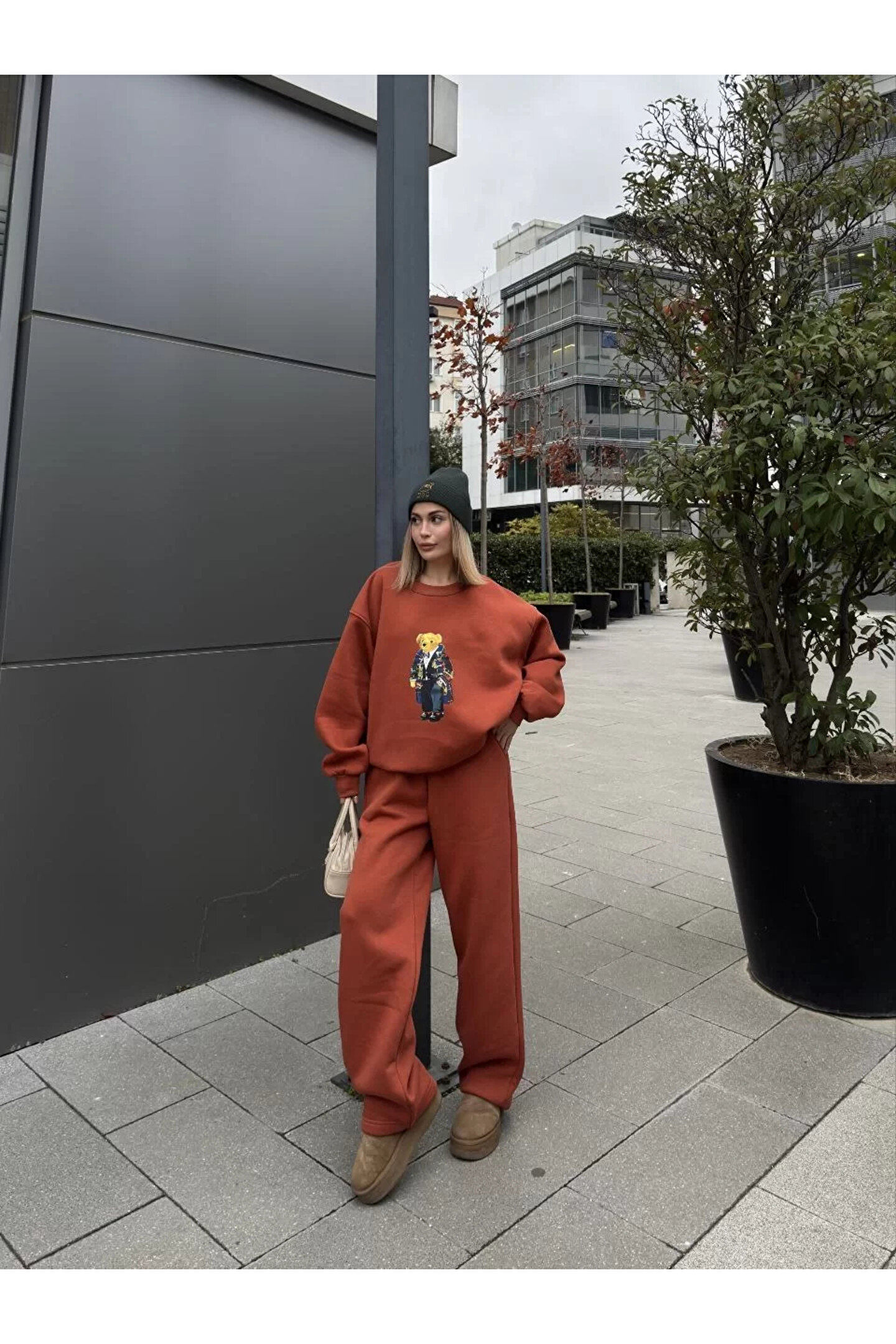 Butik Bisiklet Yaka Üç İplik Sweat Takım - kiremit