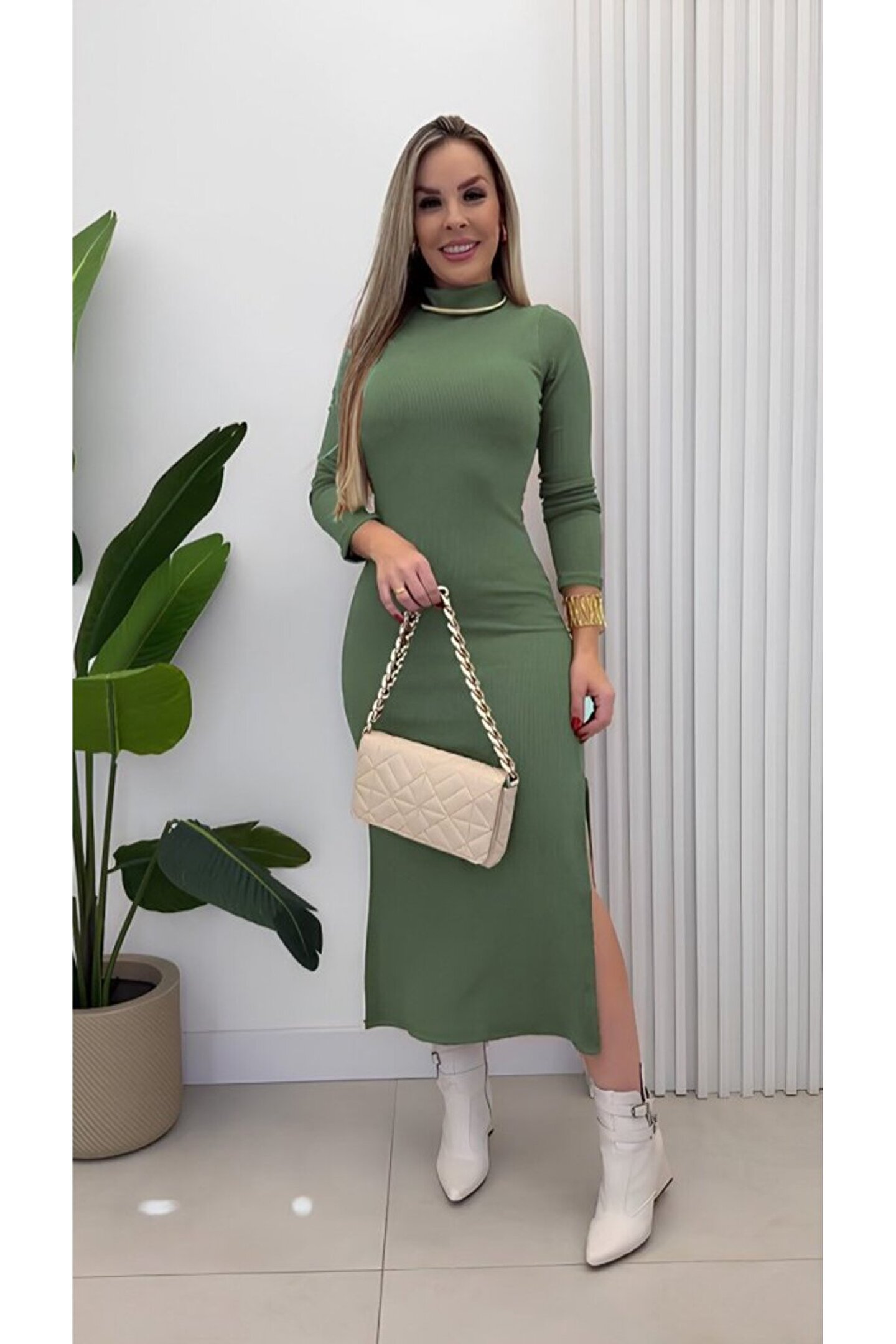 Butik EQURİ Kadın Uzun Kollu Balıkçı Yakalı Yanlardan Yırtmaçlı Kaşkorse Maxi Elbise