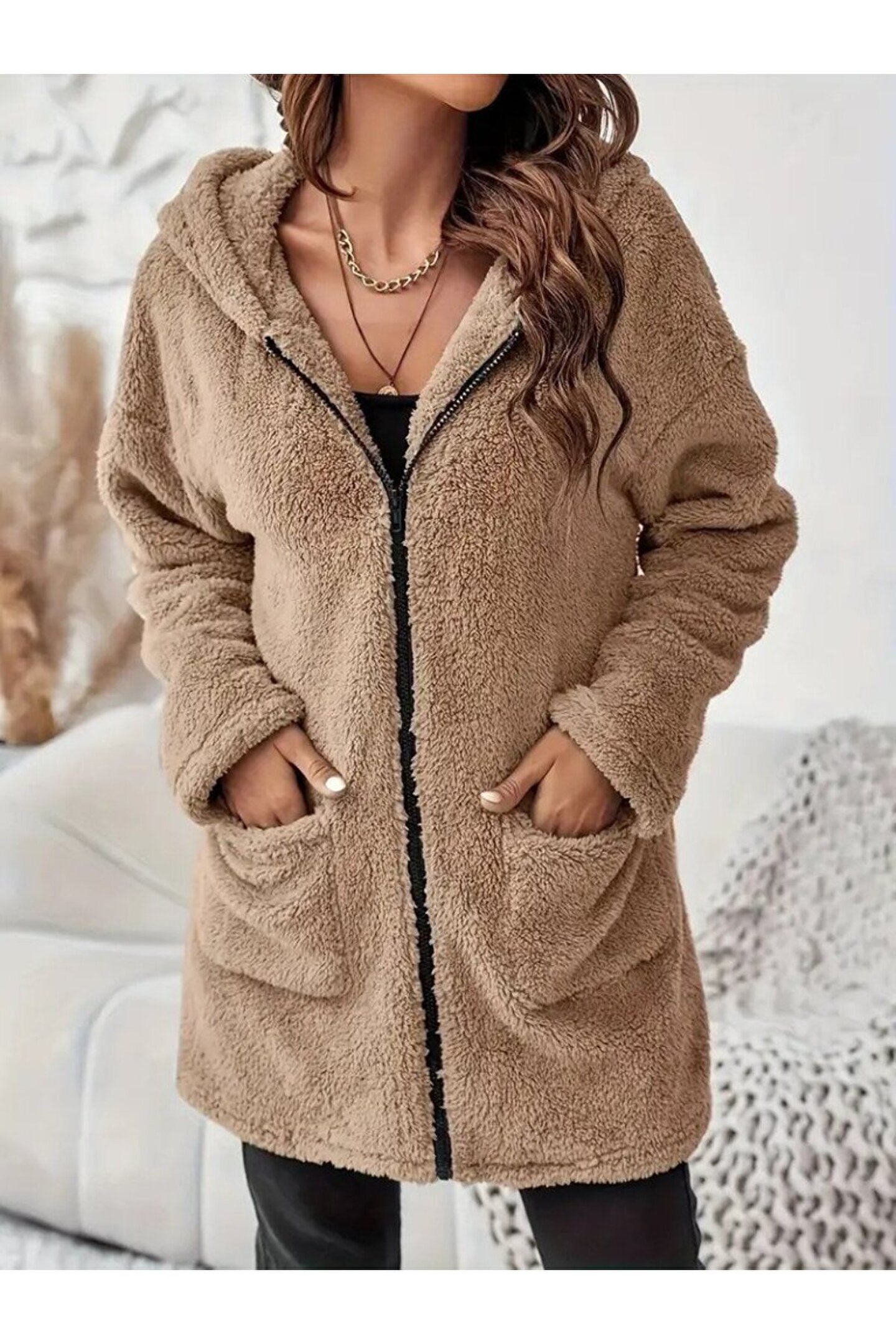 Kadın Uzun Kollu Kapşonlu önden Fermuarlı Cepli Welsoft Ceket