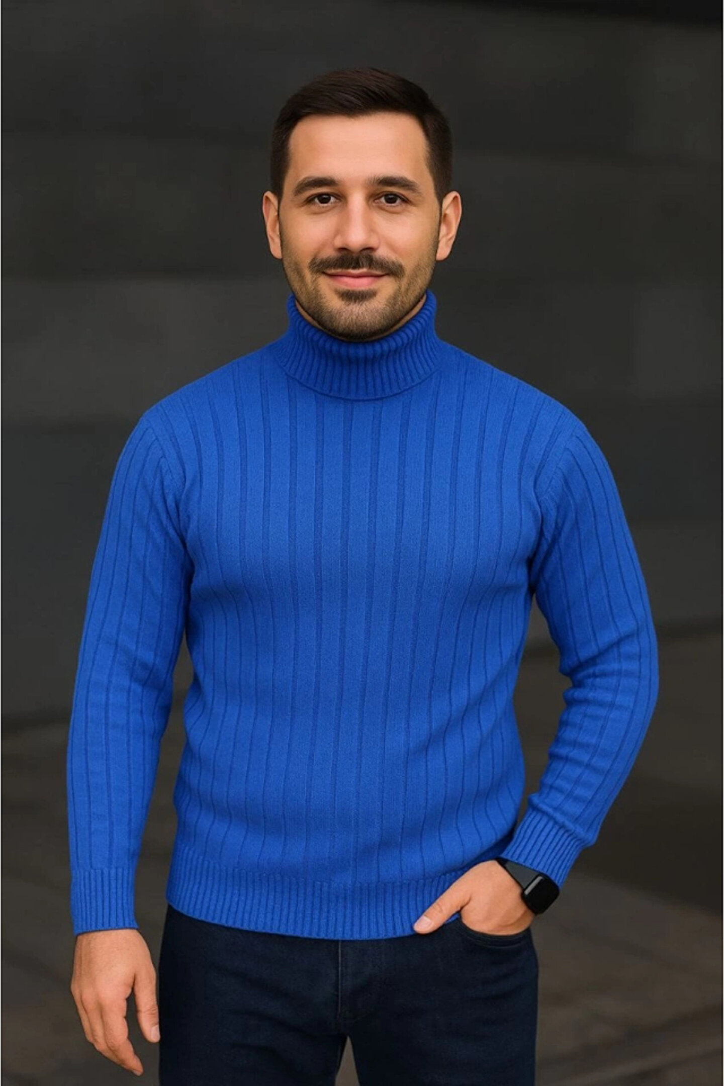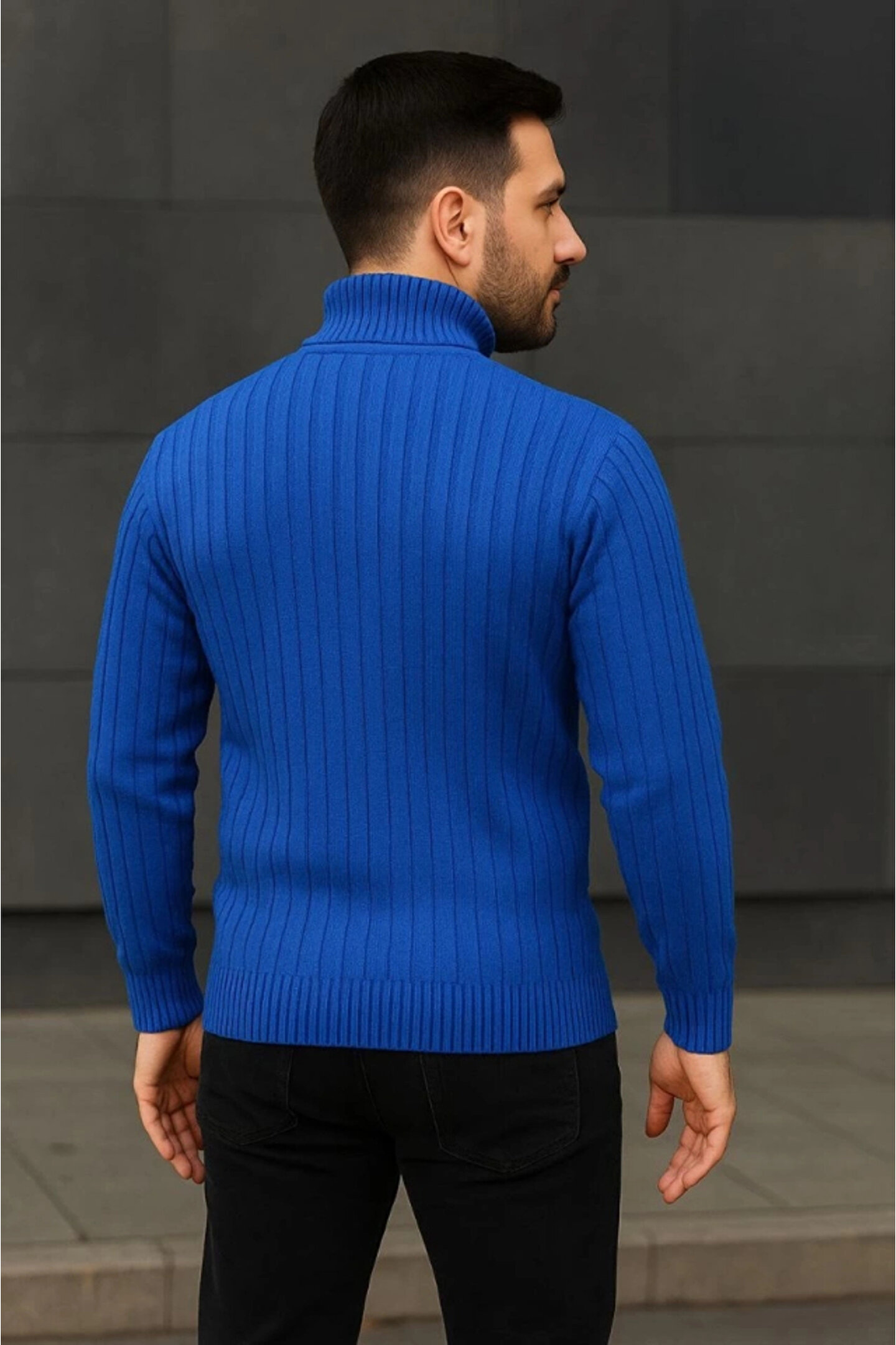 Erkek Balıkcı Yaka Bağazlı Triko Kazak Pamuklu Kalın Fitilli Dokuma, Regular Fit Uzun Kollu Kışlık Model - Saks Mavisi