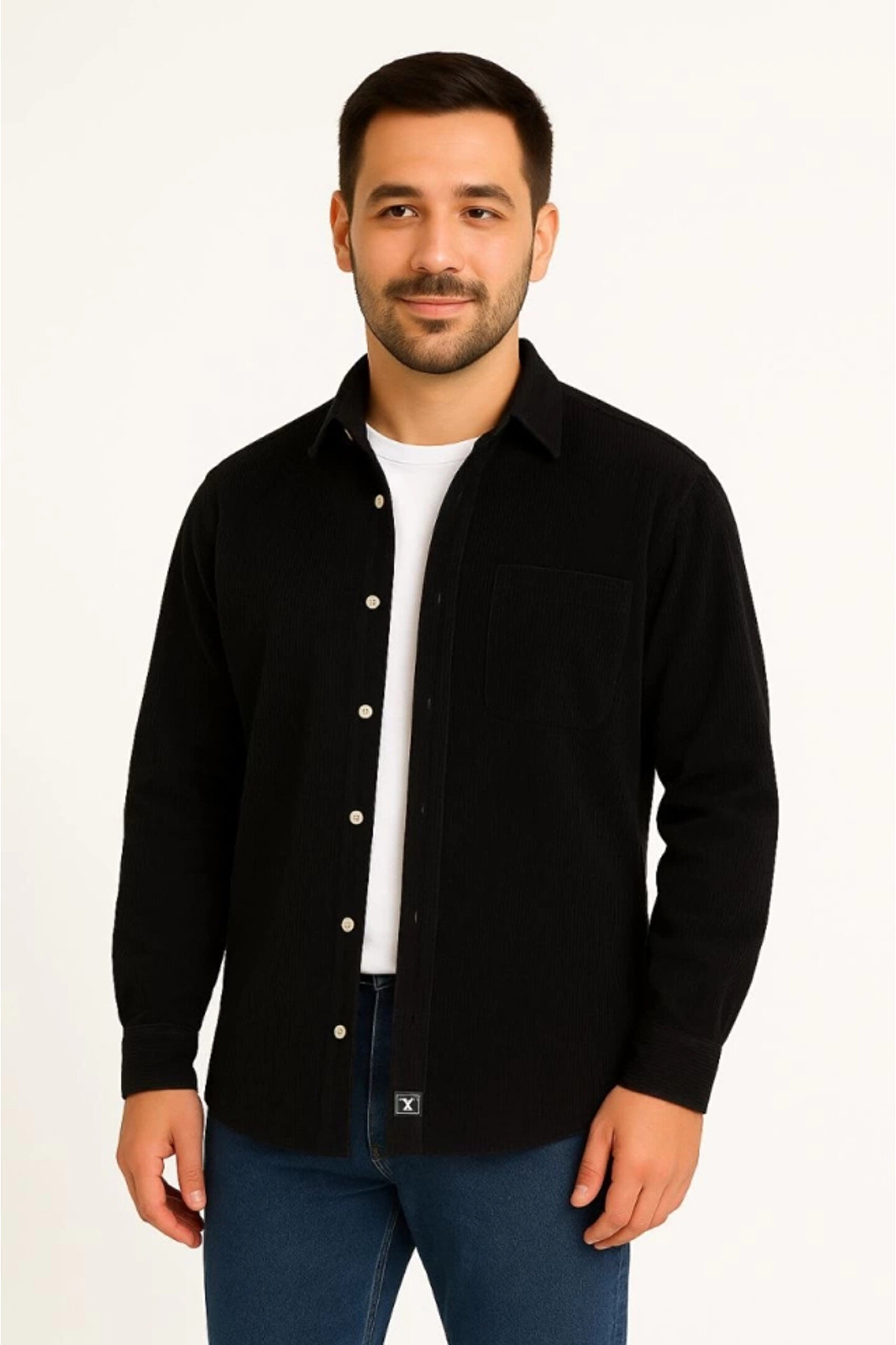 Erkek Fitilli Kadife Cepli Gömlek Oversize Rahat Kalıp - Siyah