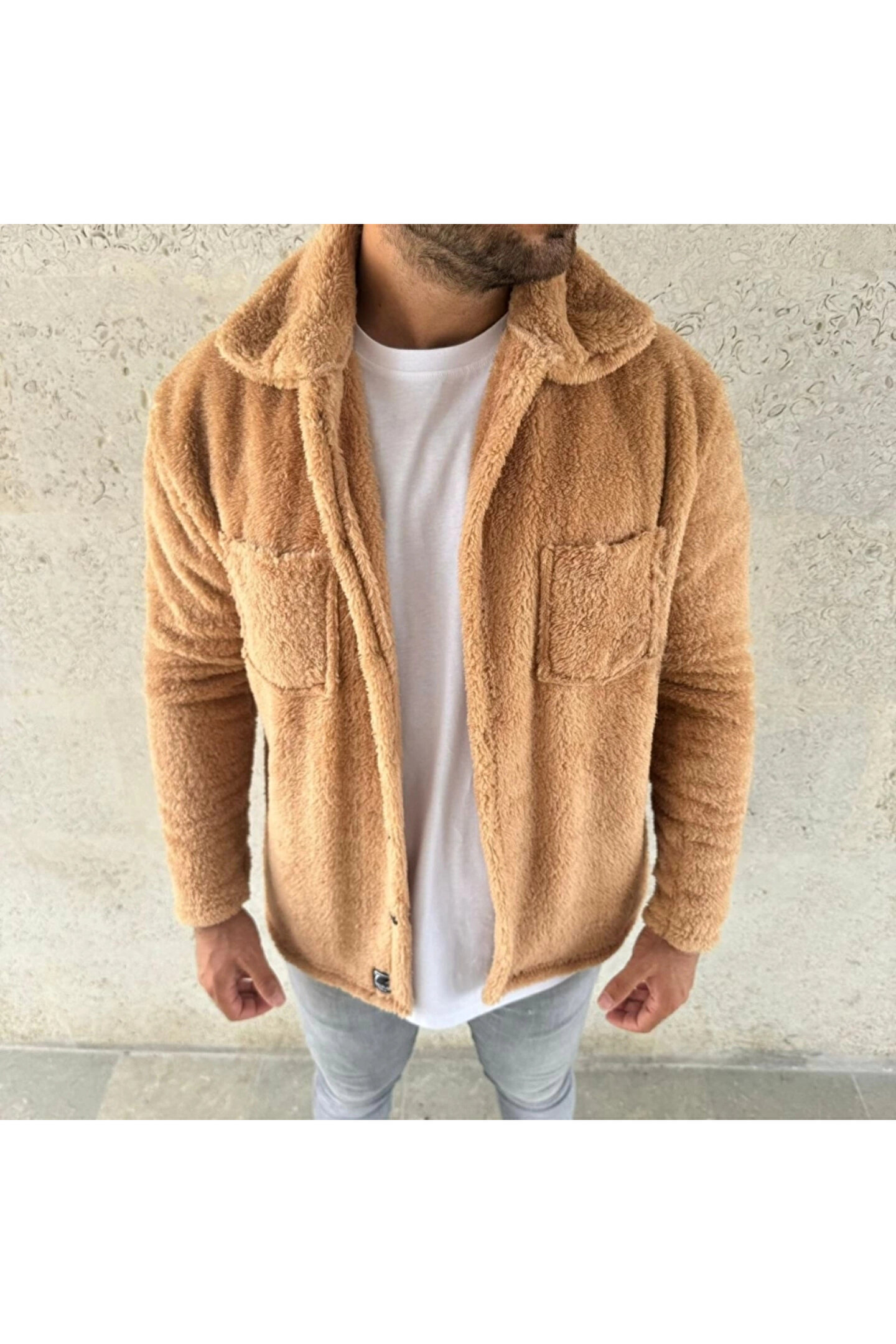 Erkek Pelüş Polar Hırka Gömlek – Yakalı, İlik Düğmeli, Göğüs Cepli, Yumuşak Dokulu Kışlık Regular Fit Rahat Günlük Model - Açık Kahve