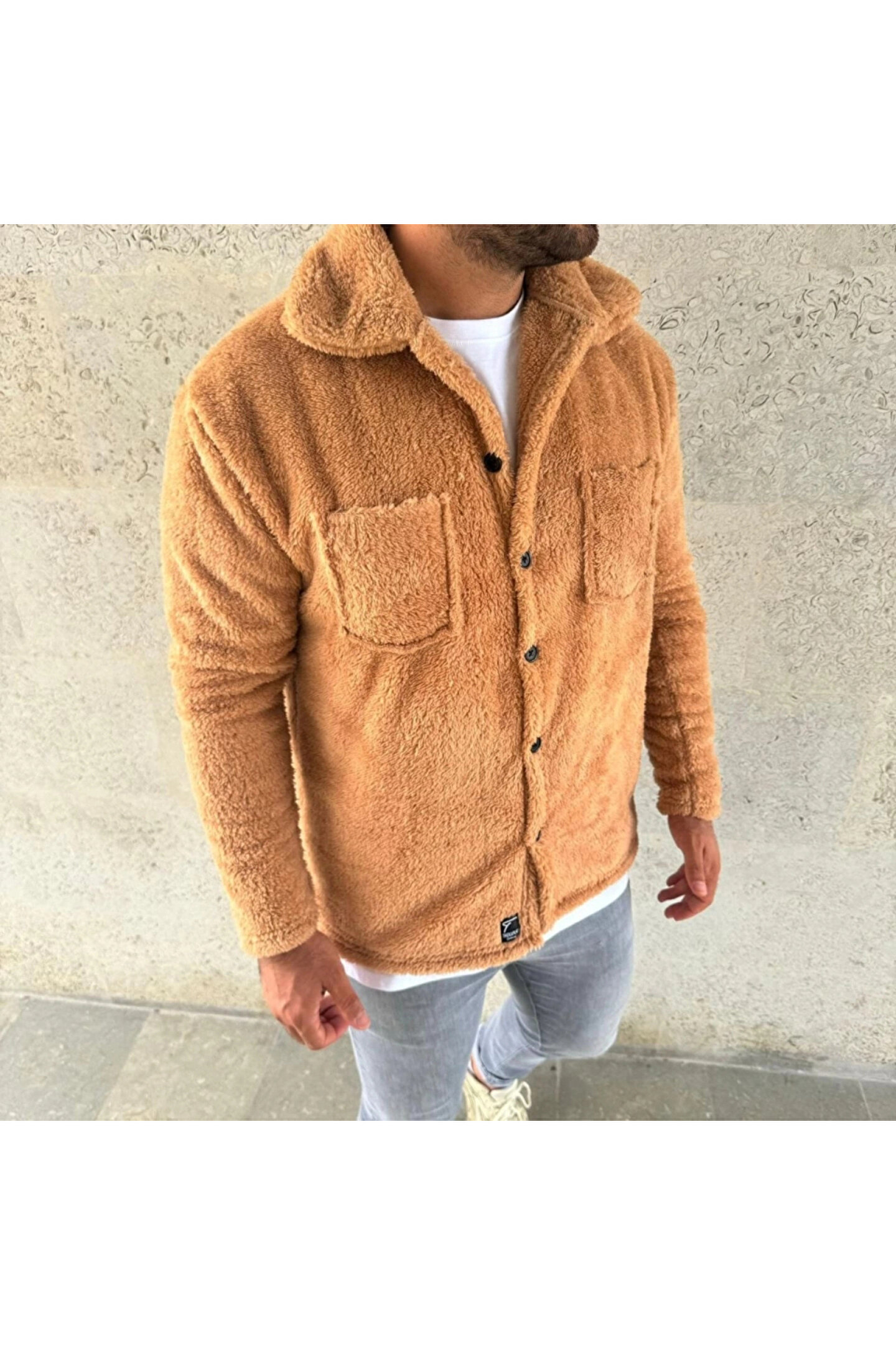 Erkek Pelüş Polar Hırka Gömlek – Yakalı, İlik Düğmeli, Göğüs Cepli, Yumuşak Dokulu Kışlık Regular Fit Rahat Günlük Model - Açık Kahve