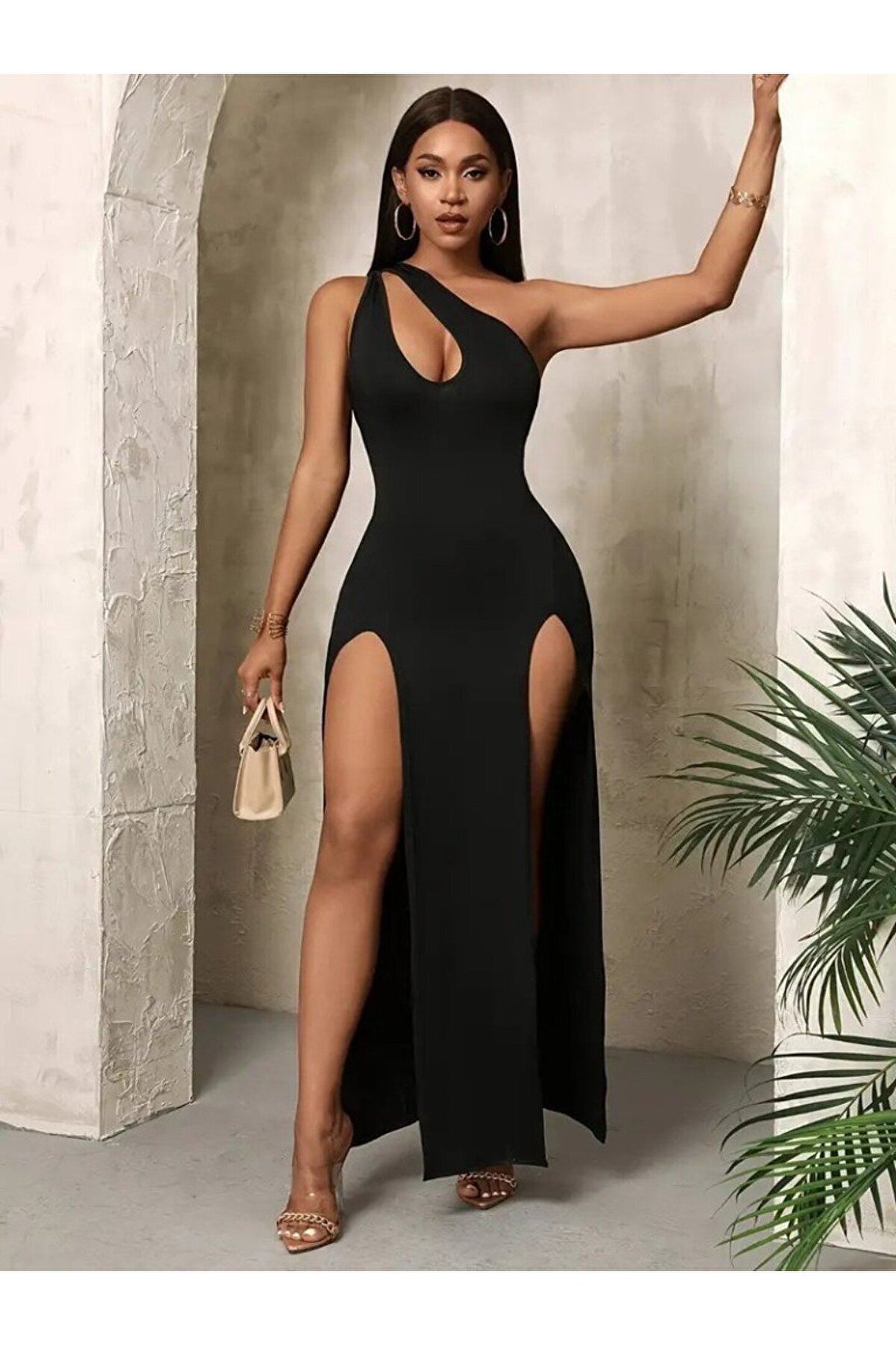 Butik Gökyüzü Moda Kadın Tek Omuzdan Açık Damla Detaylı Yırtmaç Detaylı Uzun Janjan Krep Elbise