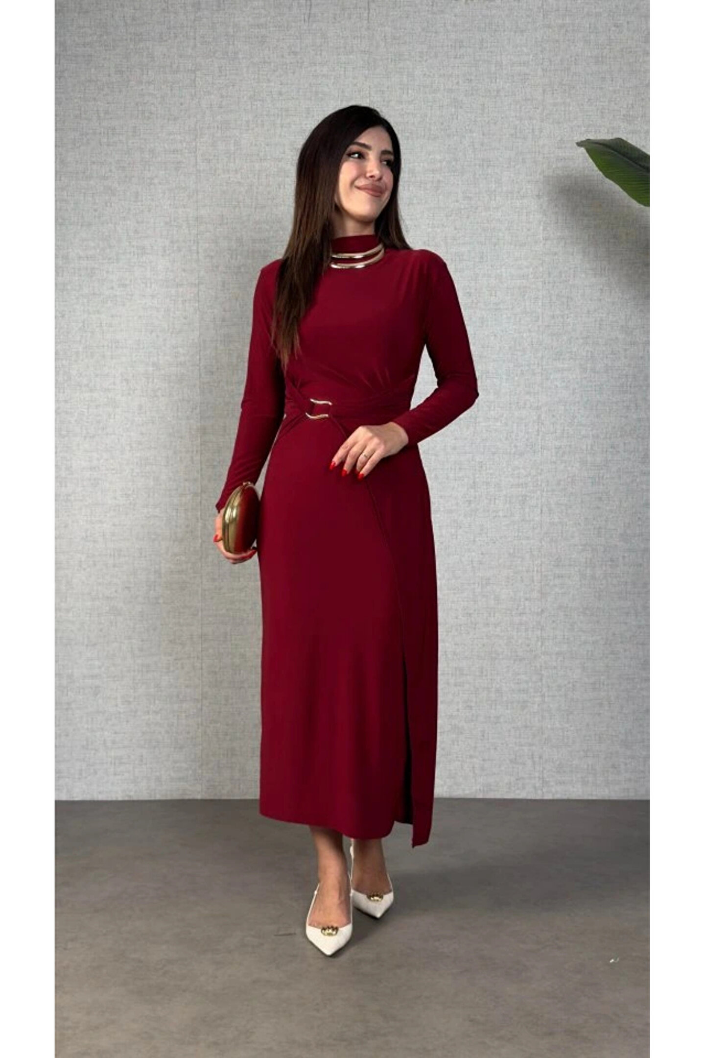 Kadın Balıkçı Yaka Toka Detay Sandy Kumaş Midi Boy Elbise