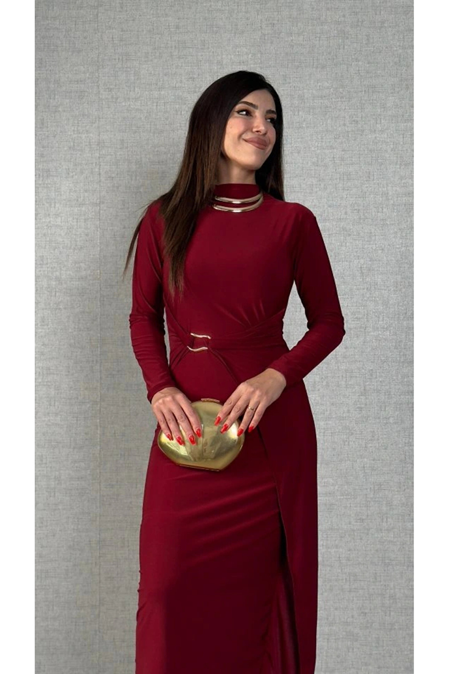 Butik Kadın Balıkçı Yaka Toka Detay Sandy Kumaş Midi Boy Elbise