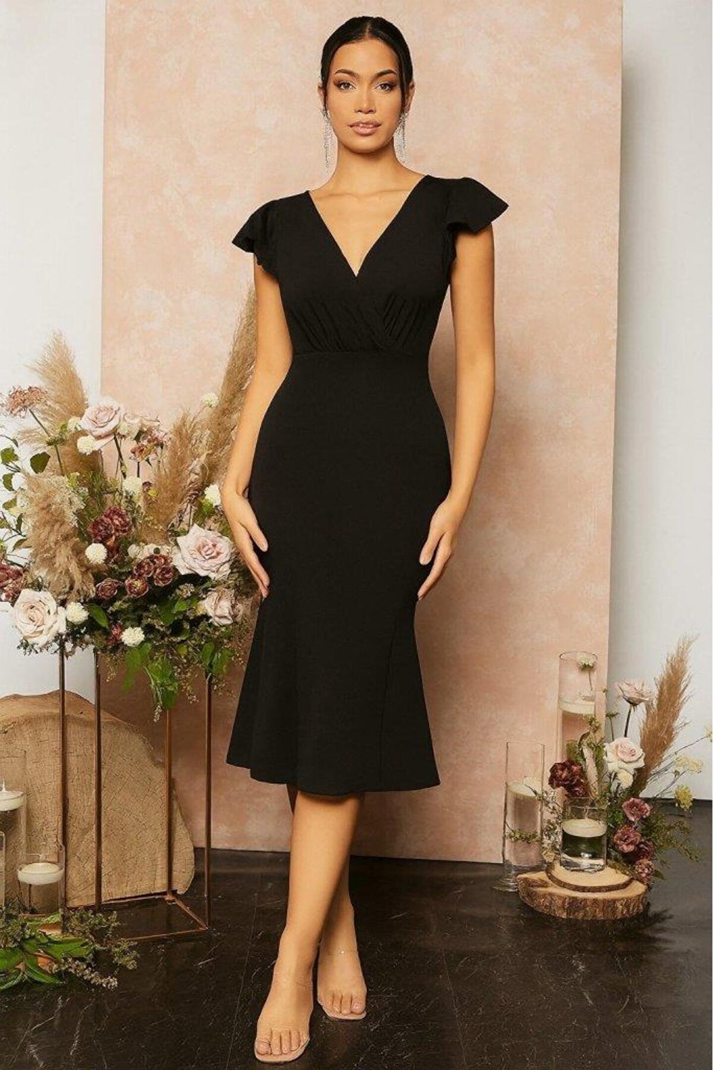 Kadın Kısa Kelebek Kollu Kruvaze Yaka Ithal Krep Midi Elbise