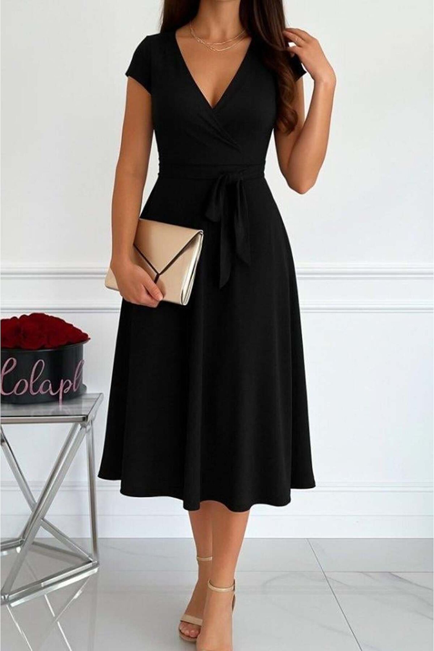 Butik Kadın Kısa Kollu V Yakalı Belden Kuşaklı Maksi Boy Viskon Elbise