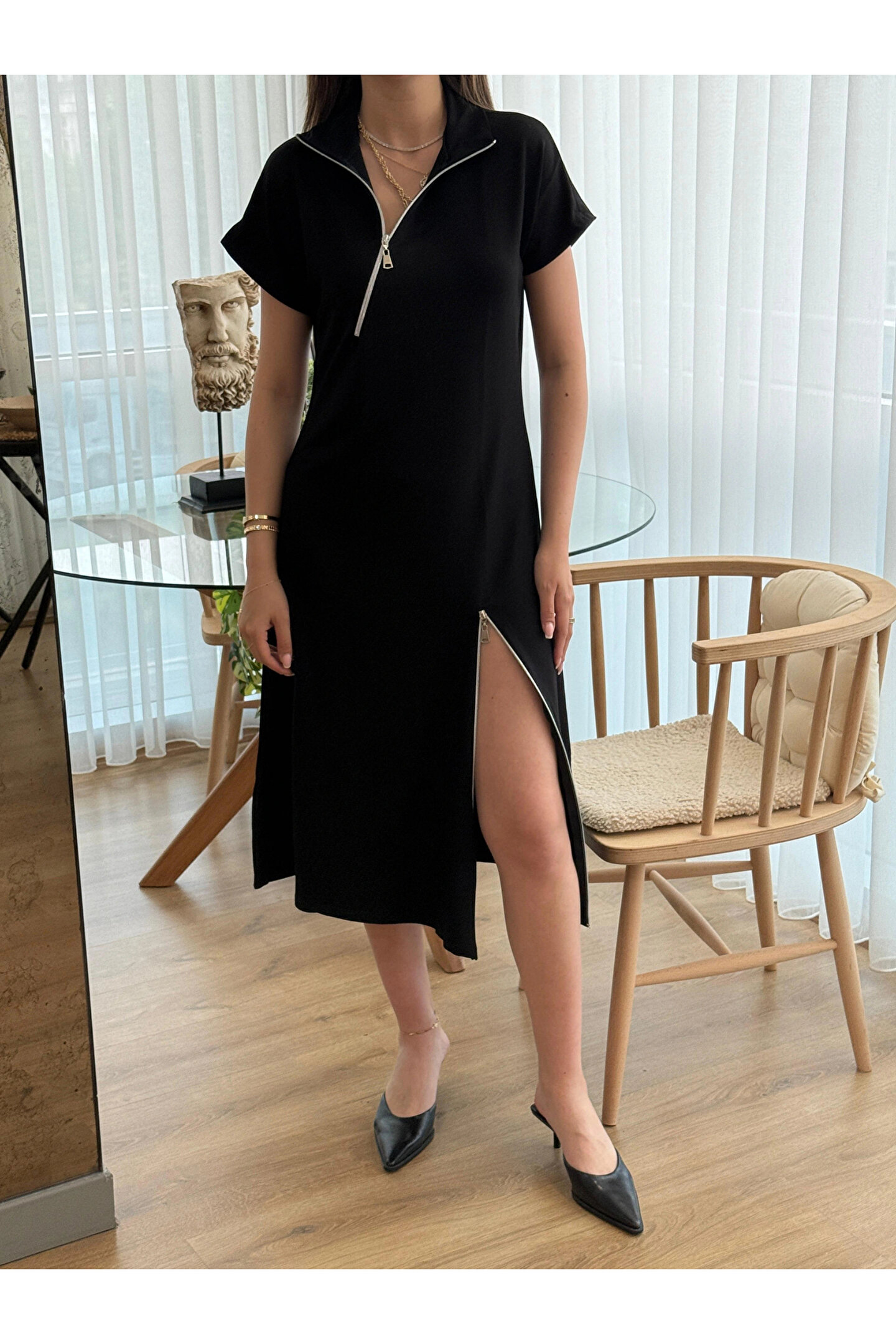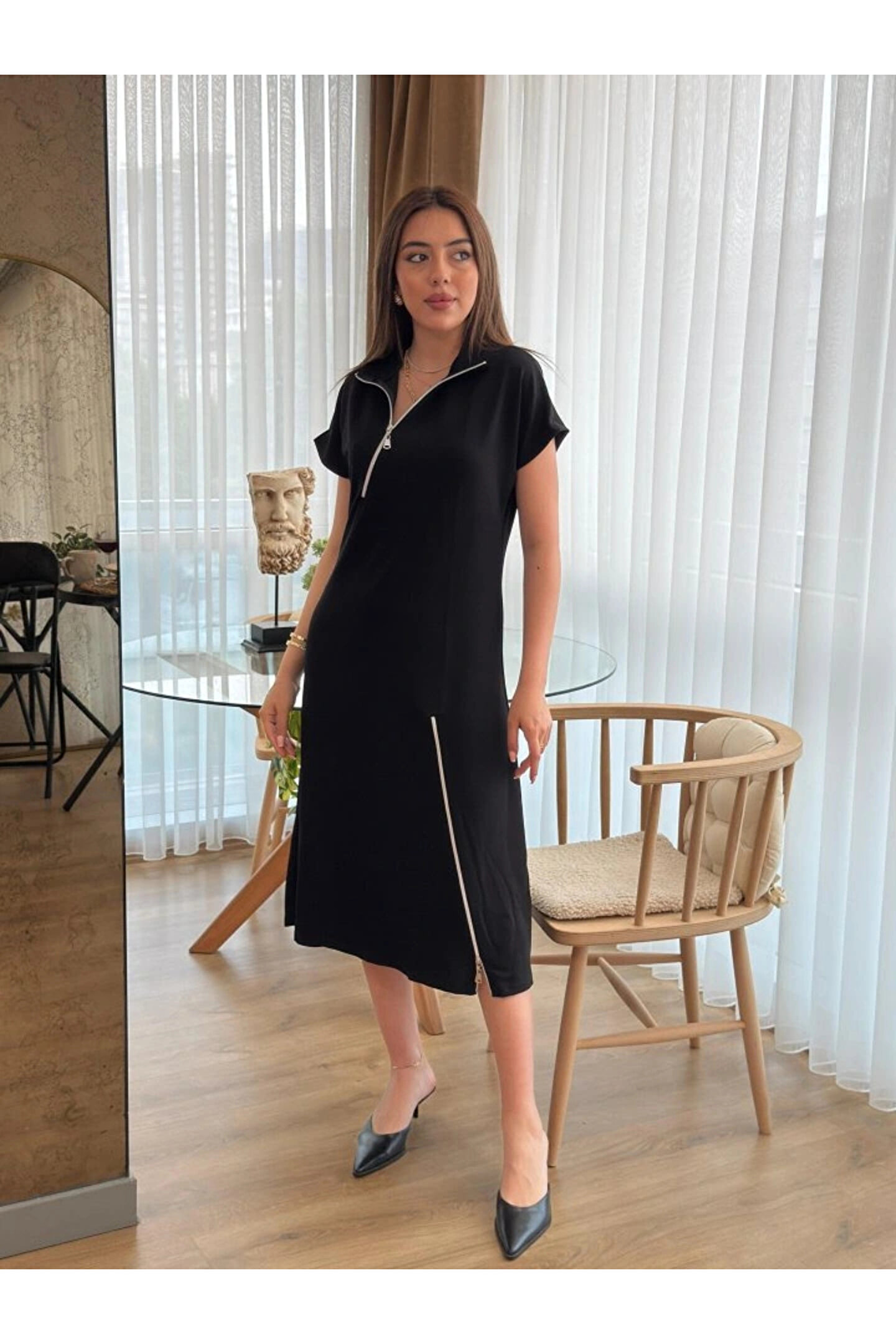 Kadın Kısa Kollu Yakadan Ve Etekten Fermuarlı Midi Viskon Iki Iplik Elbise