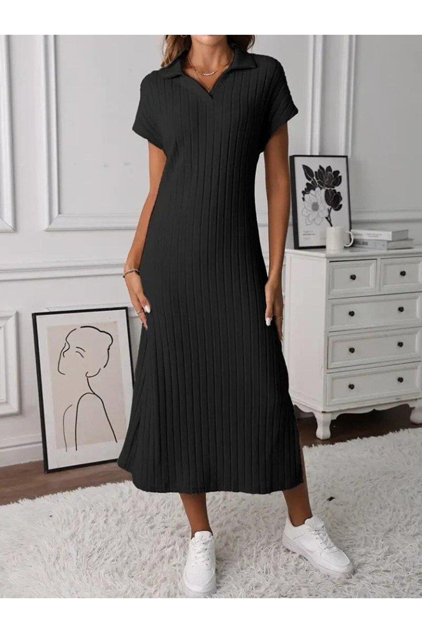 Butik Kadın Kısa Kollu Yakalı Yandan Yırtmaçlı Kalın Fitilli Kaşkorse Elbise