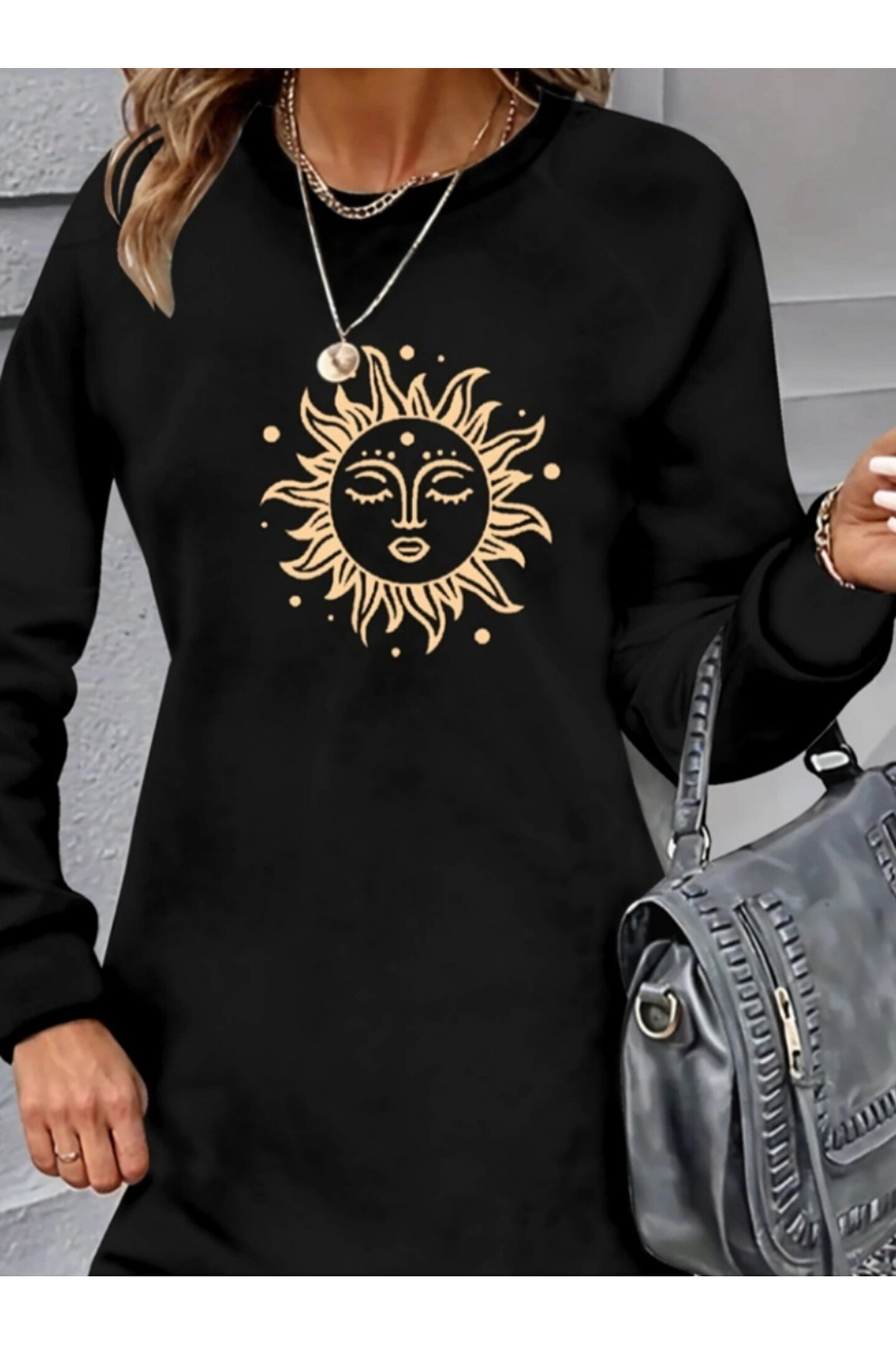 Butik Kadın Uzun Kollu Bisiklet Yaka Güneş Desenli Viskon Iki Iplik Elbise