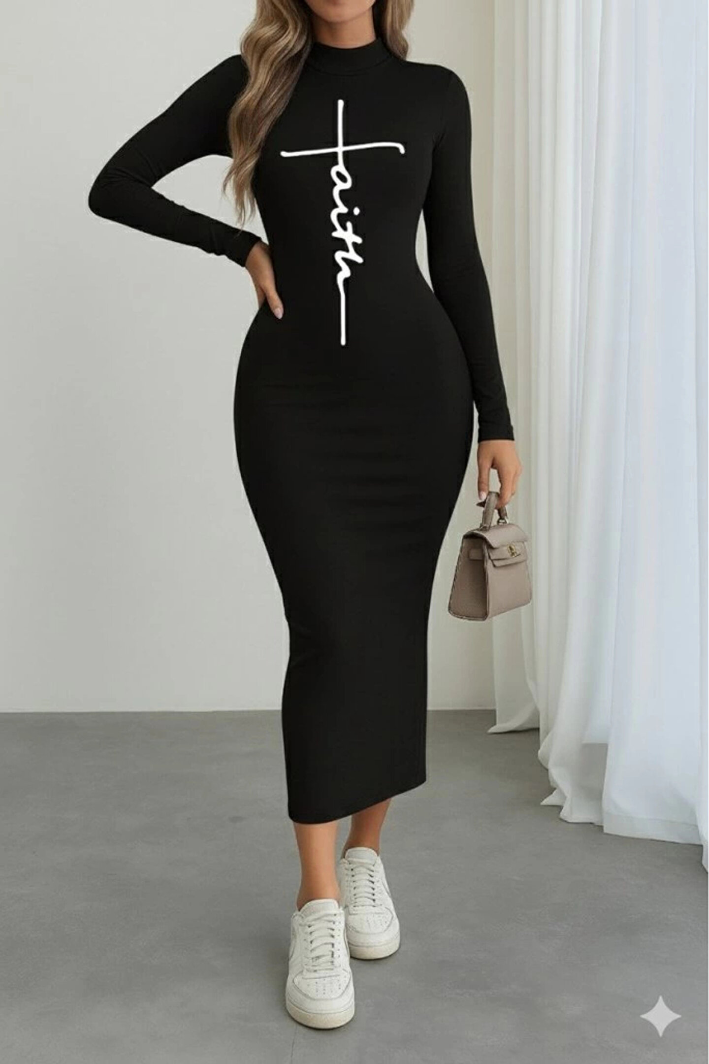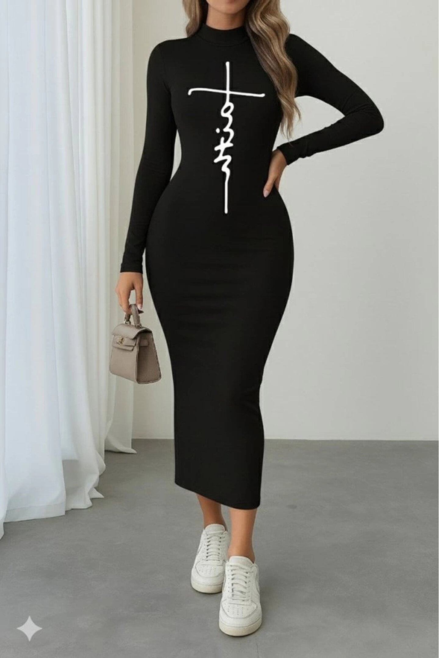Kadın Uzun Kollu Boğazlı Baskı Detaylı Viskon Tam Boy Elbise