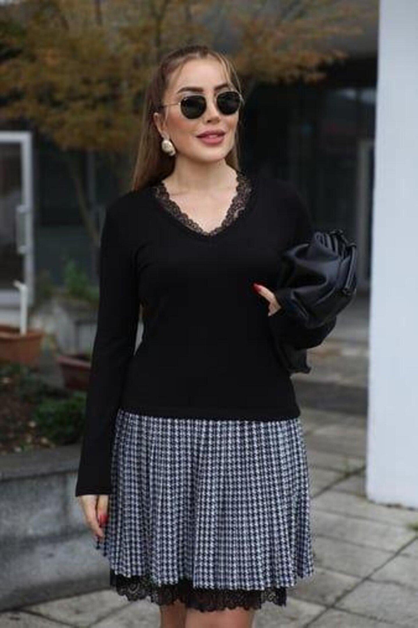 Kadın Uzun Kollu Denteli Yaka Ekose Etek Detay Diz üstü Elbise