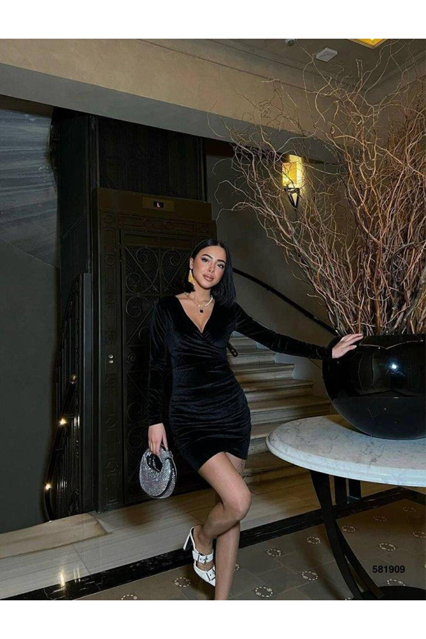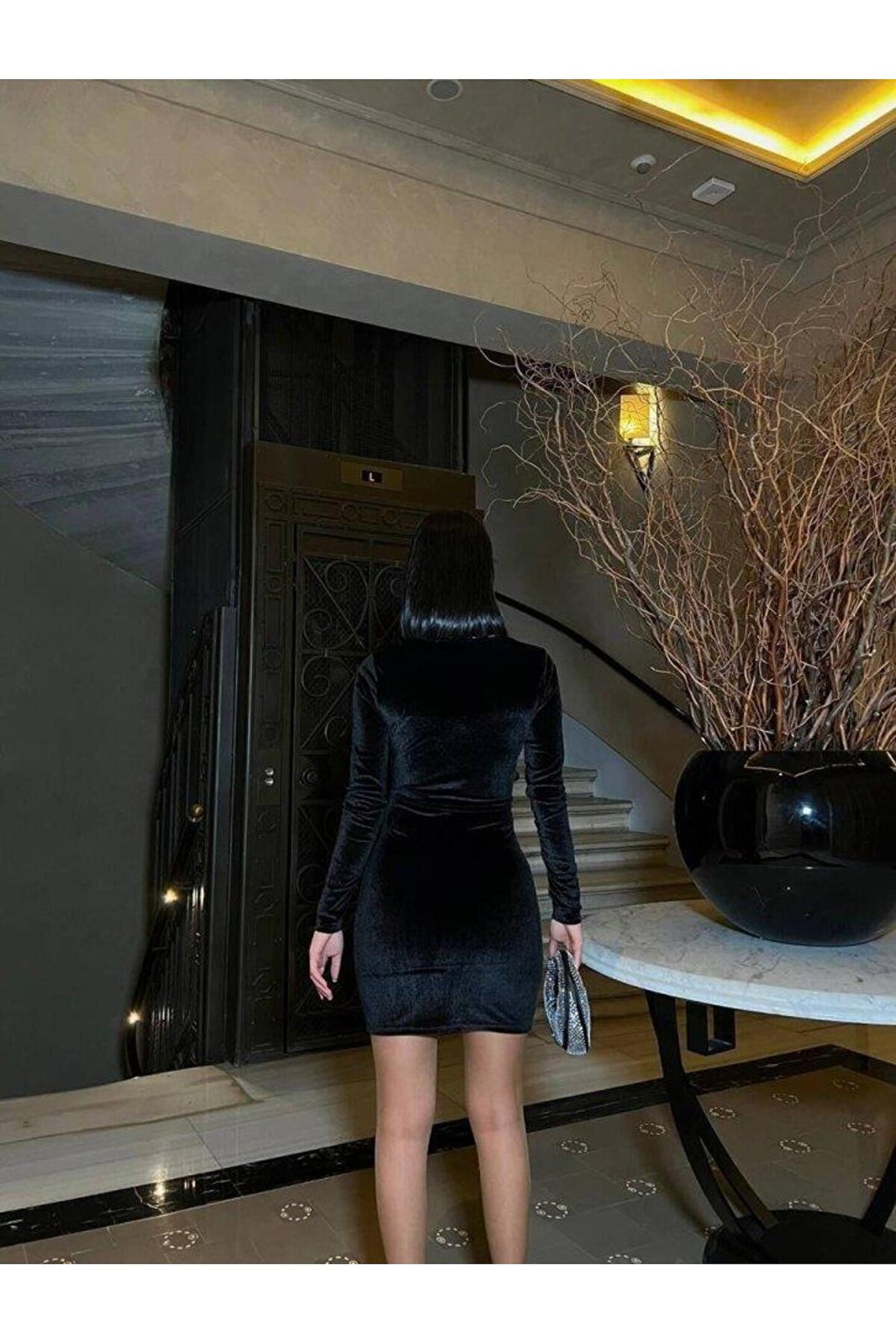 Butik Kadın Uzun Kollu Göğüs Dekolteli Kadife Kumaş Mini Kruvaze Elbise