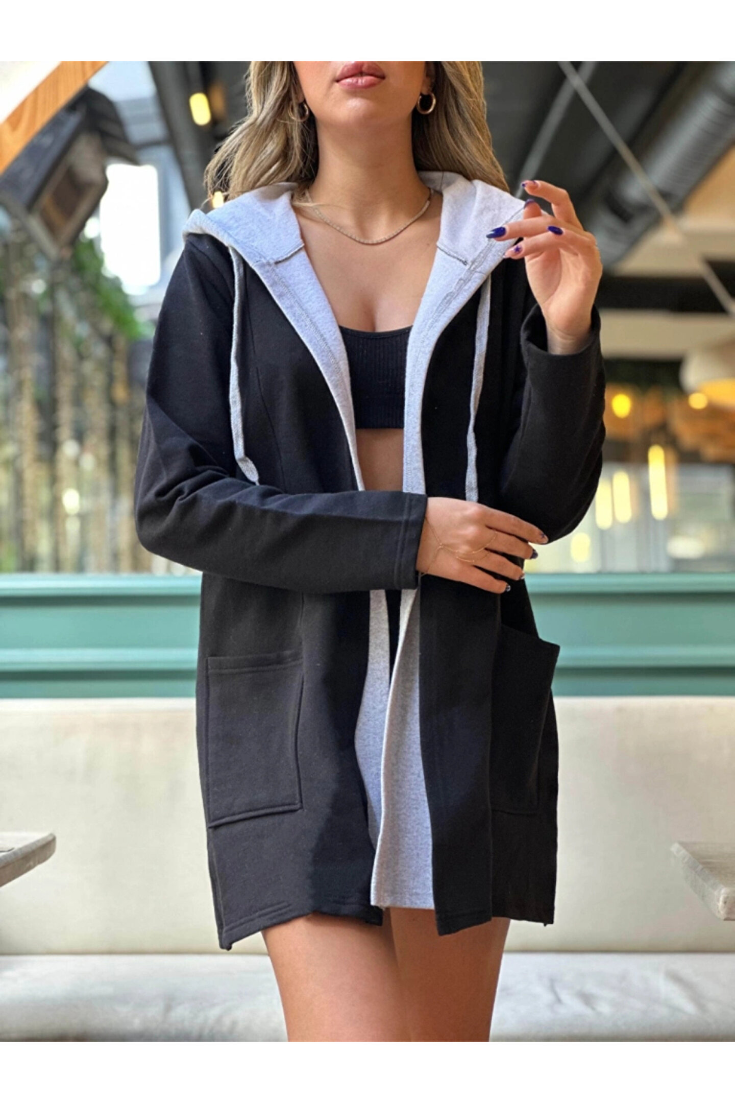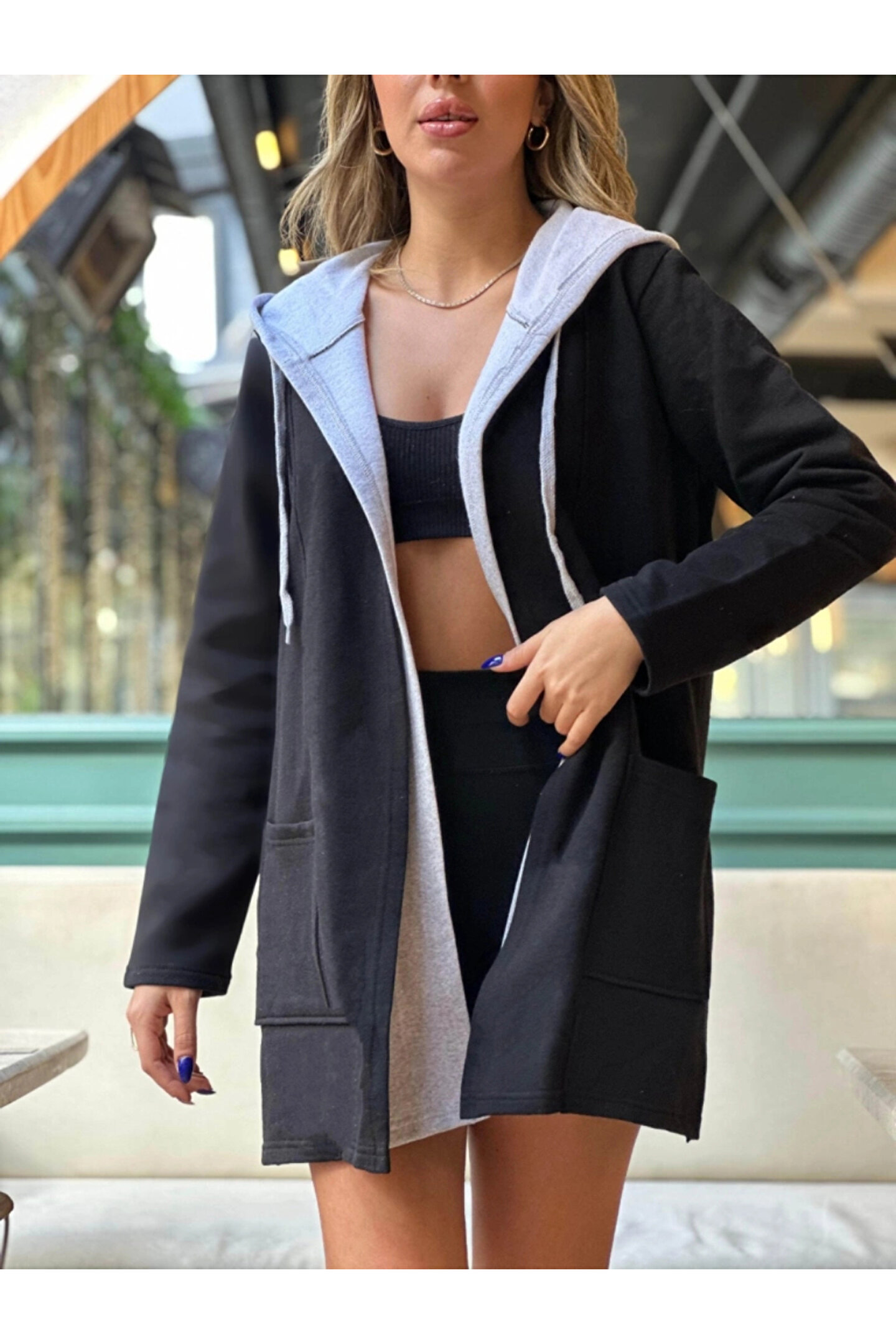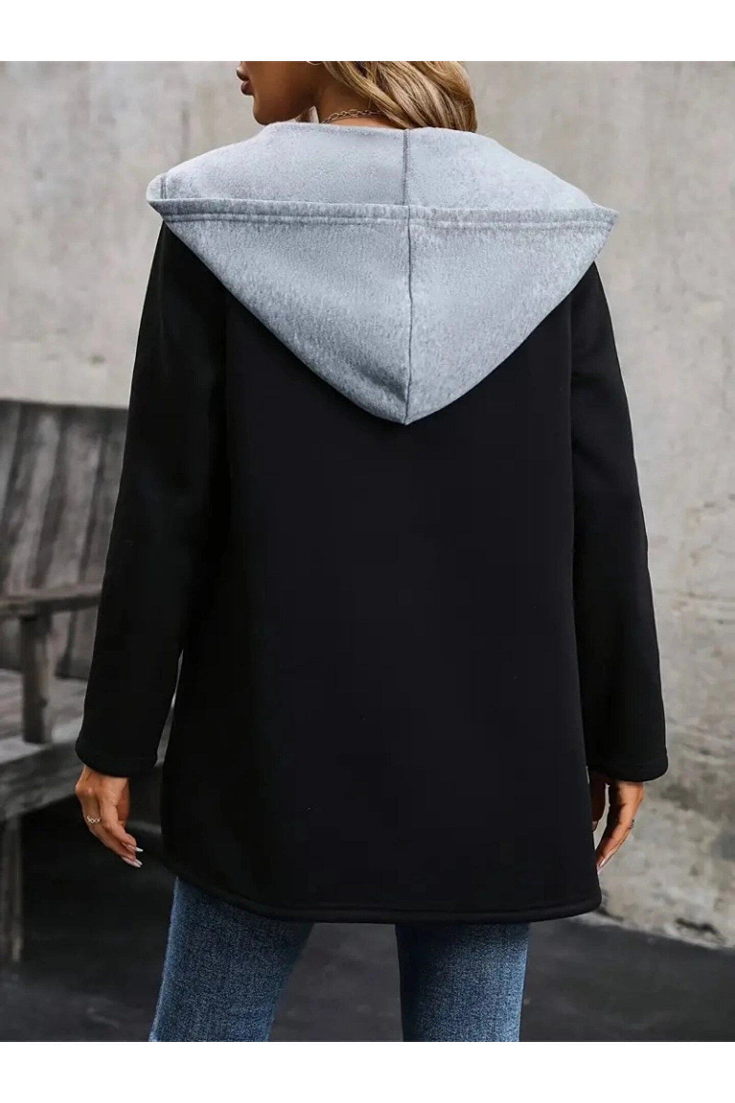Butik Kadın Uzun Kollu Kapşonlu çift Renkli şardonlu Iki Iplik Ceket
