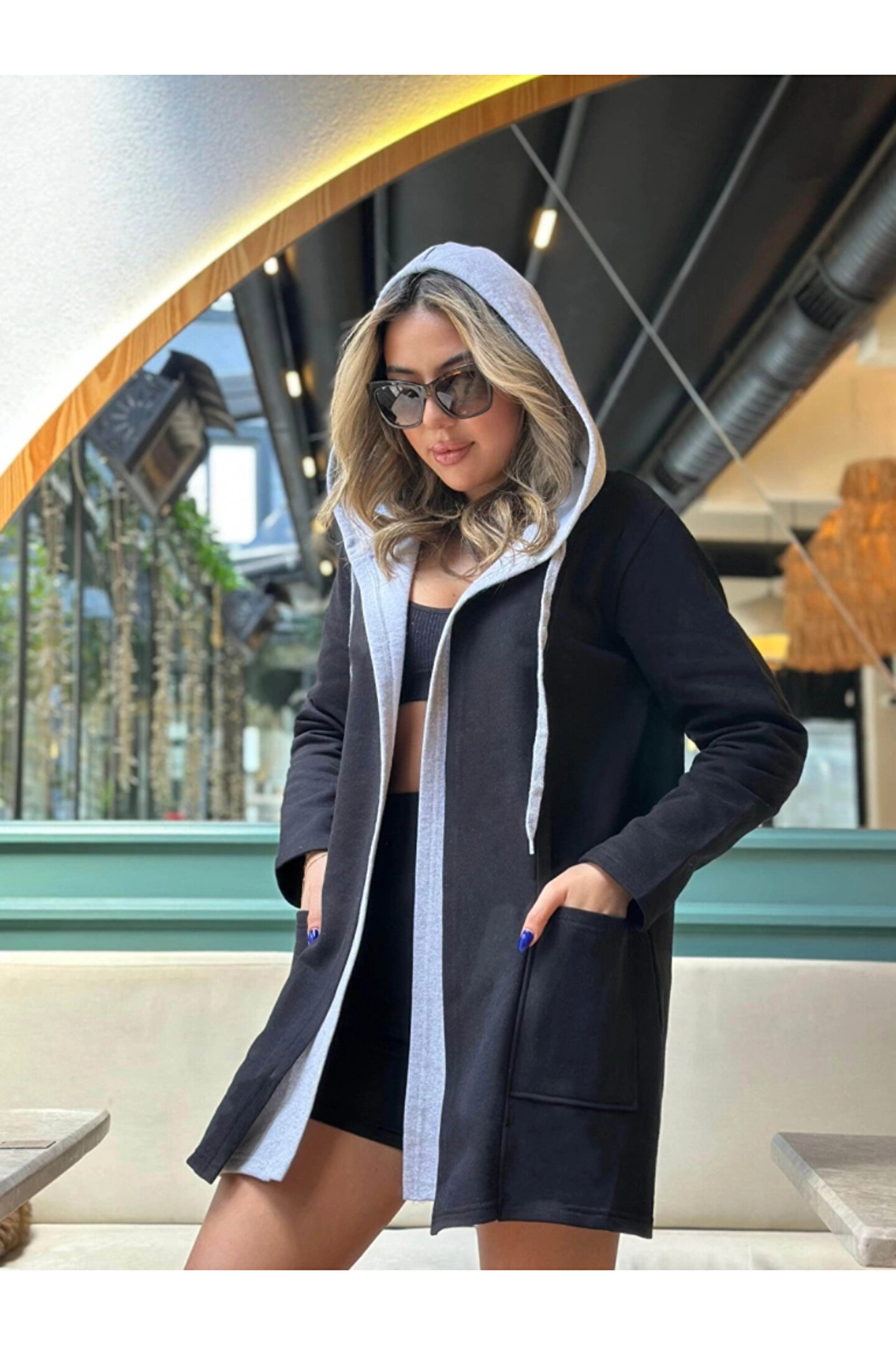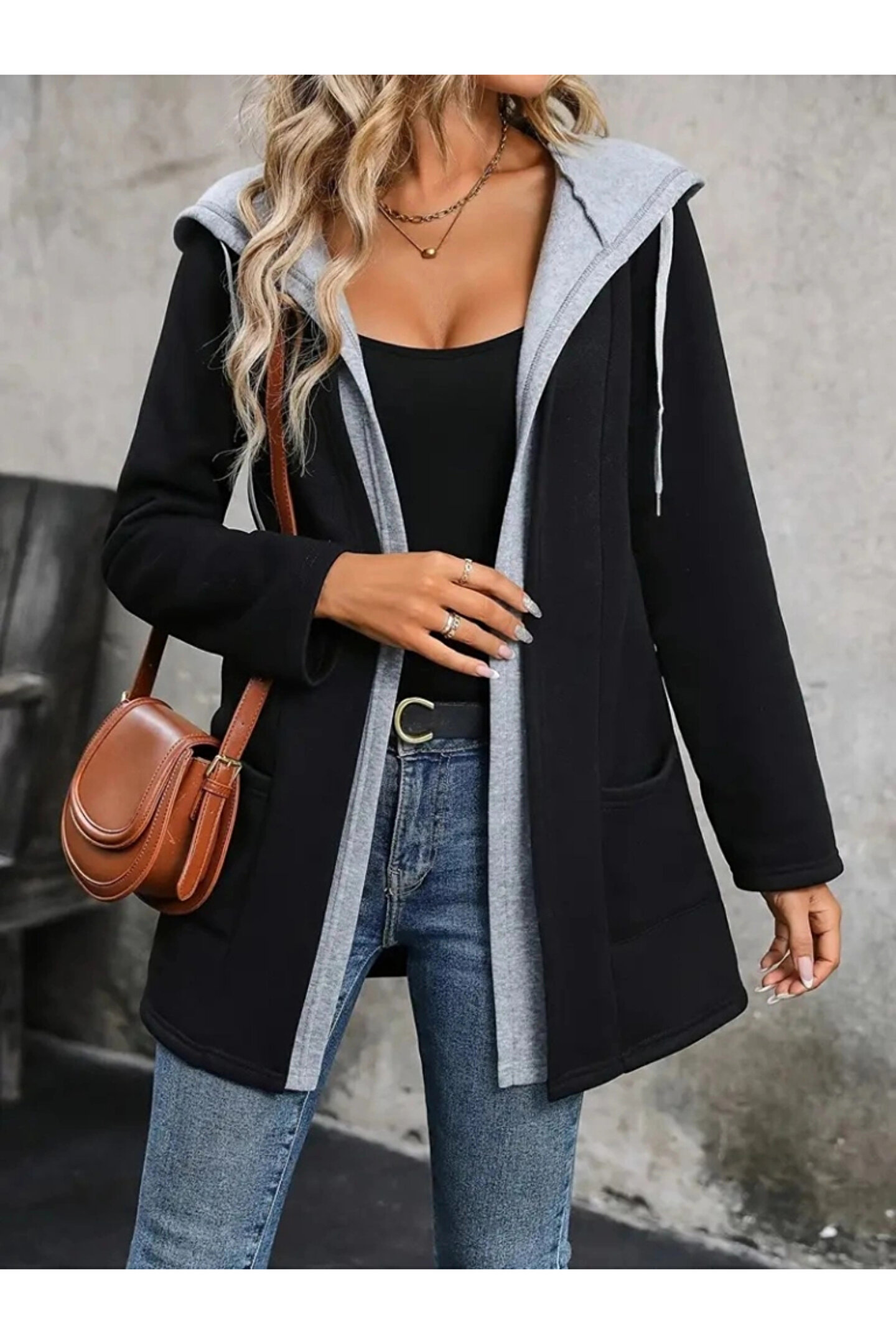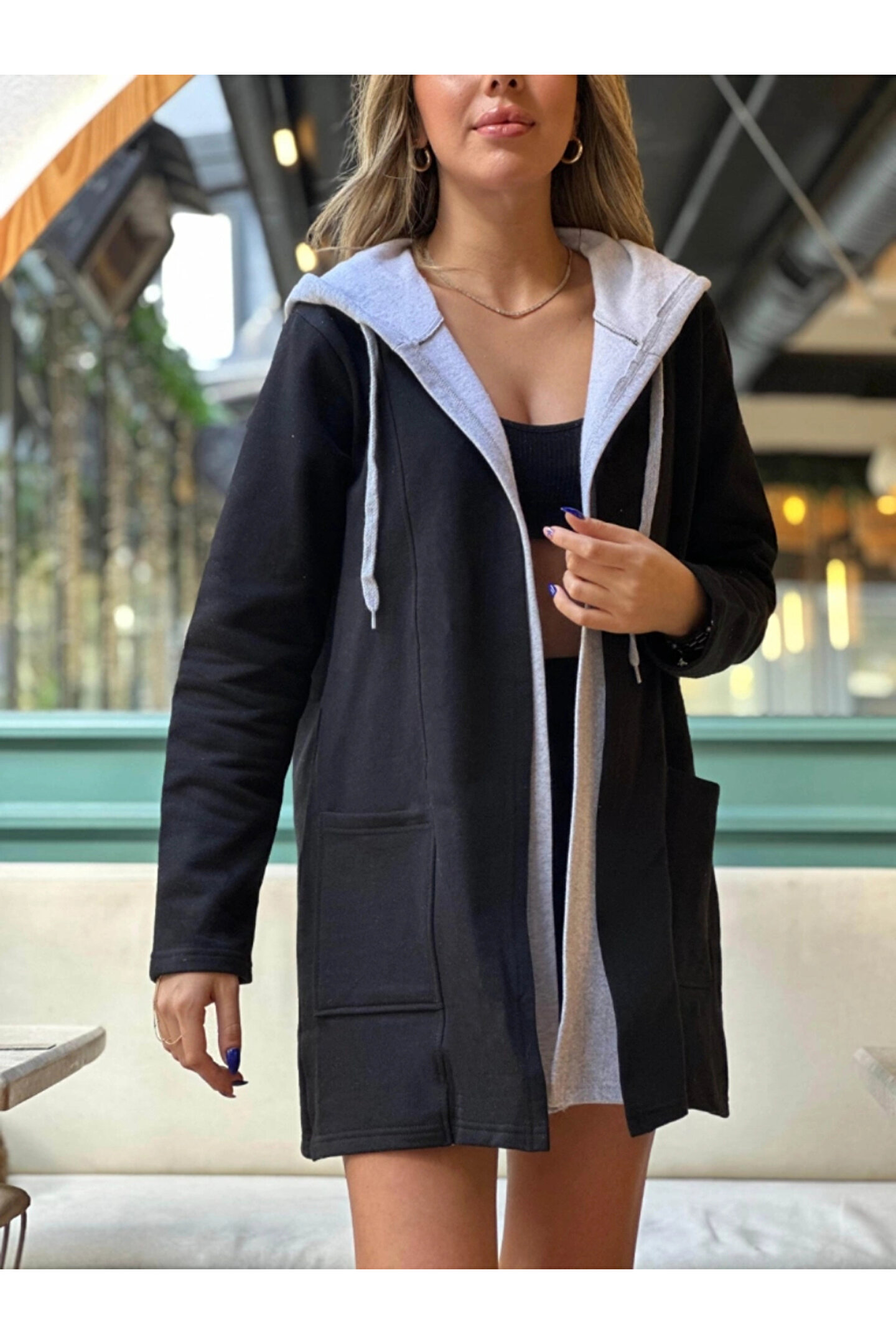Butik Kadın Uzun Kollu Kapşonlu çift Renkli şardonlu Iki Iplik Ceket