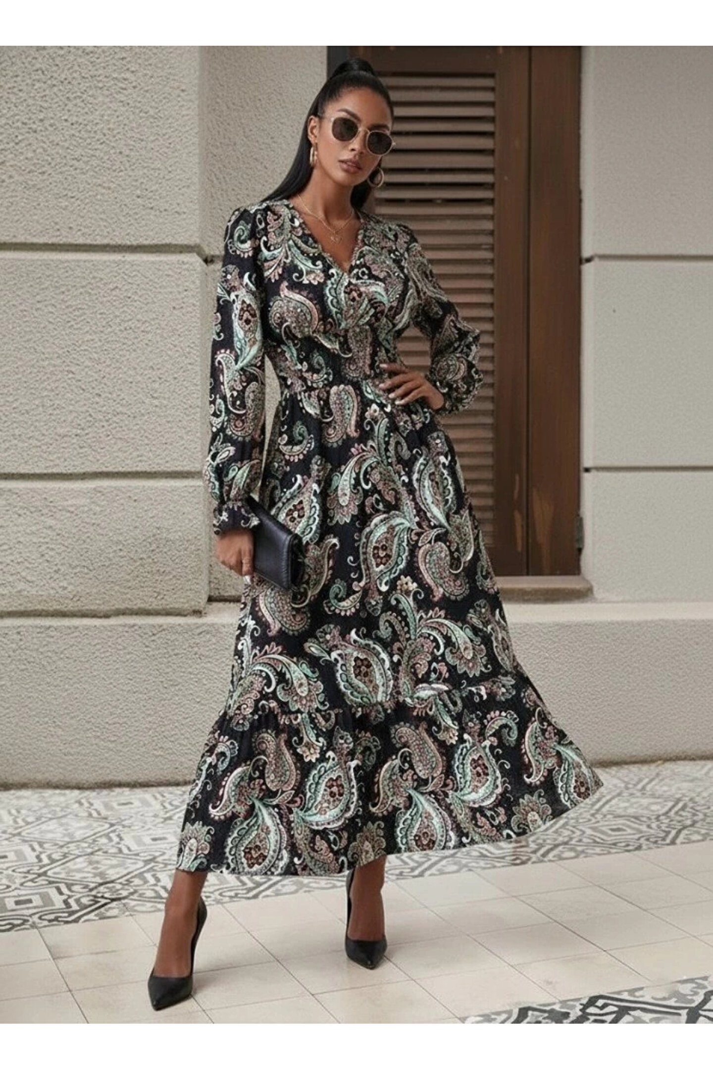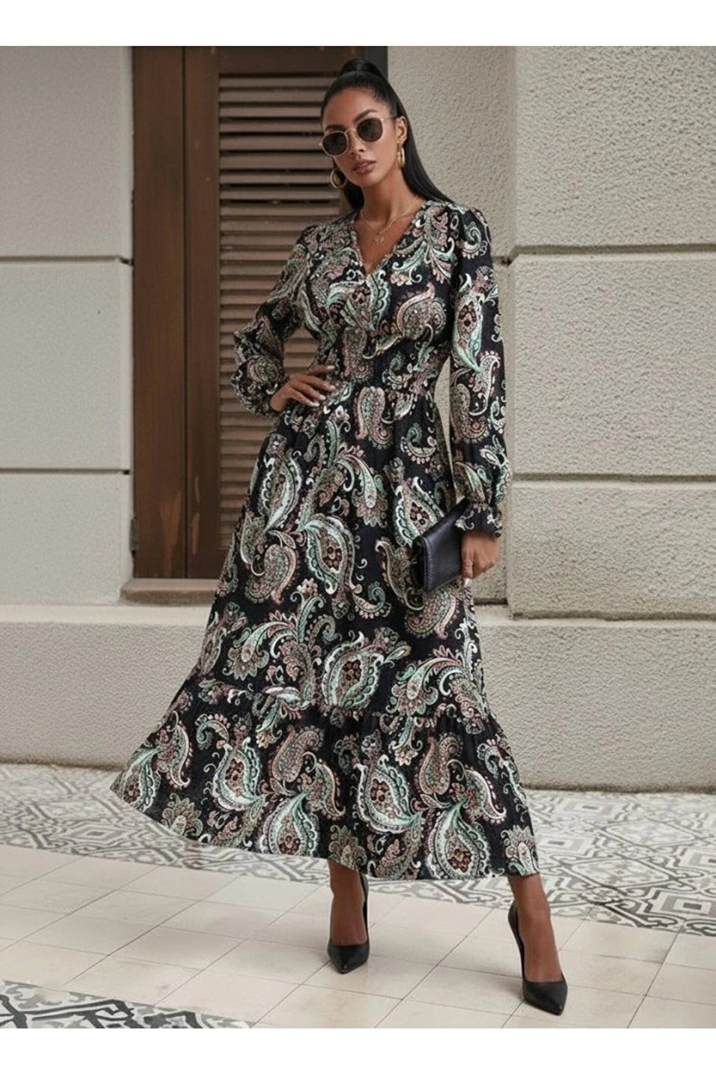 Butik Kadın Uzun Kollu Kruvaze Yaka Beli Lastikli Uzun Desenli Maxi Elbise