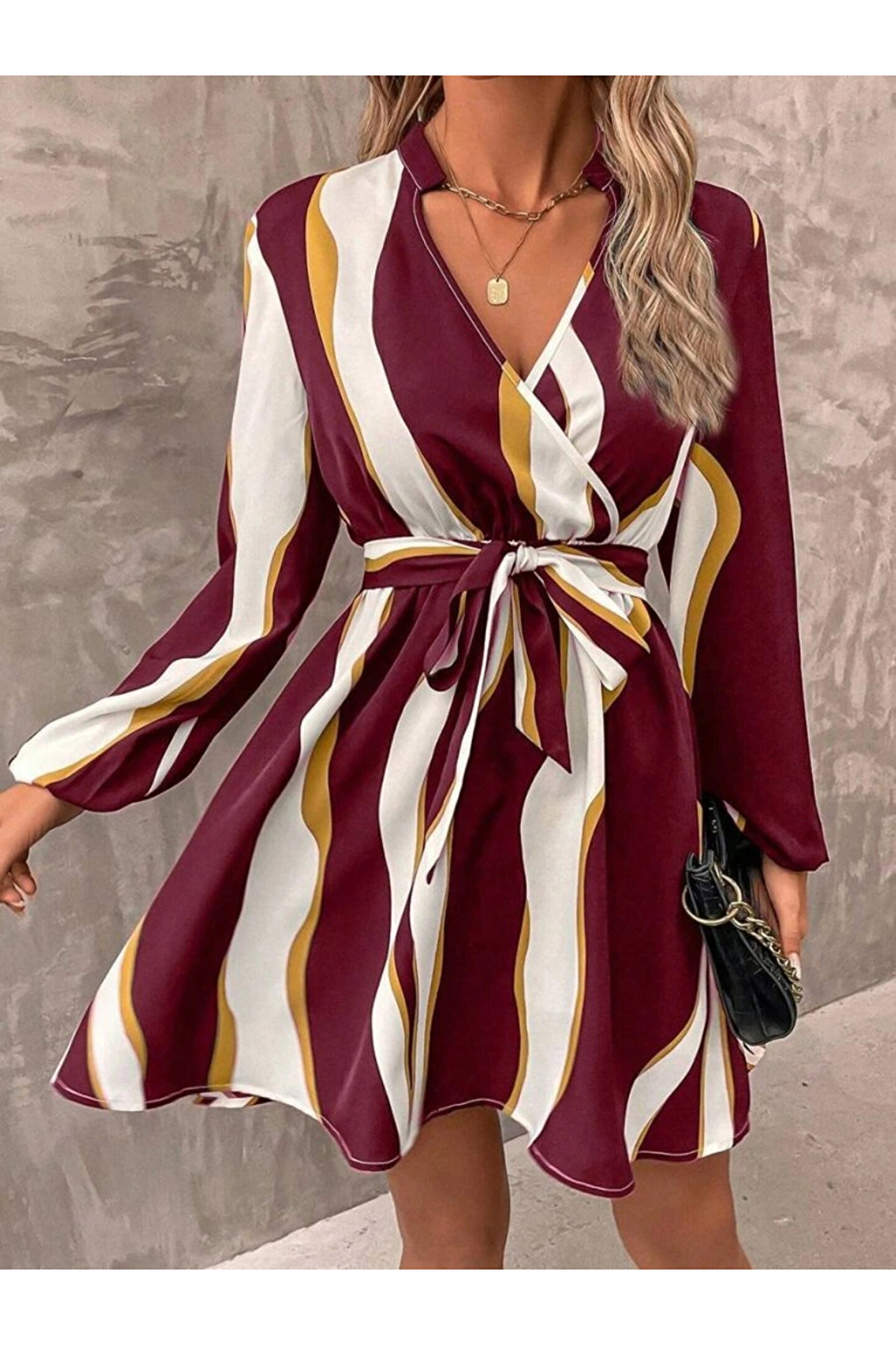 Butik Kadın Uzun Kollu Kruvaze Yakalı Desenli Modal Mini Elbise