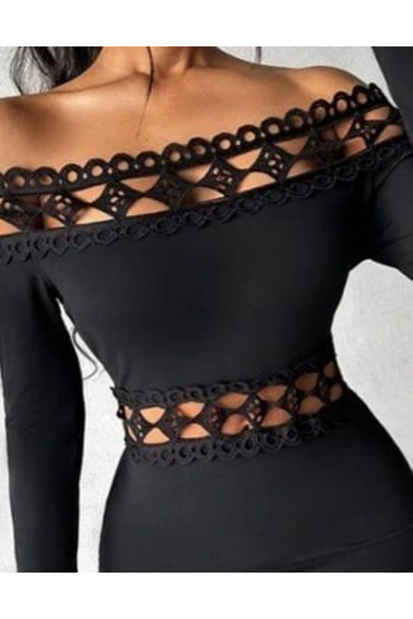 Butik Kadın Uzun Kollu Madonna Dantel Yaka Yırtmaçlı Midi Dalgıç Elbise
