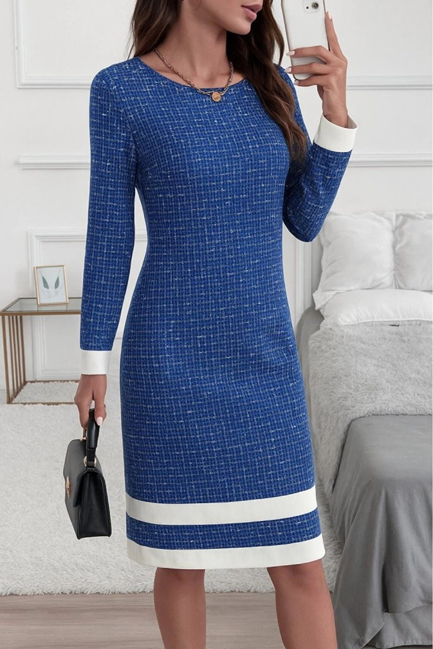 Butik Kadın Uzun Kollu Yuvarlak Yaka Etek Ucu şerit Detaylı Mini Dokuma Elbise