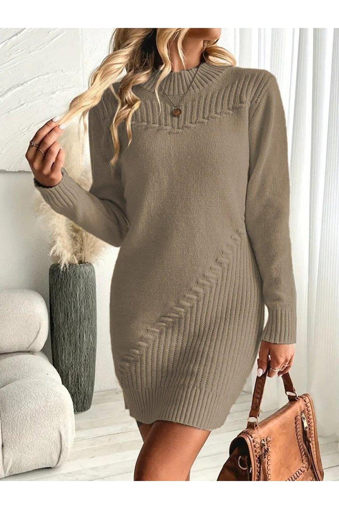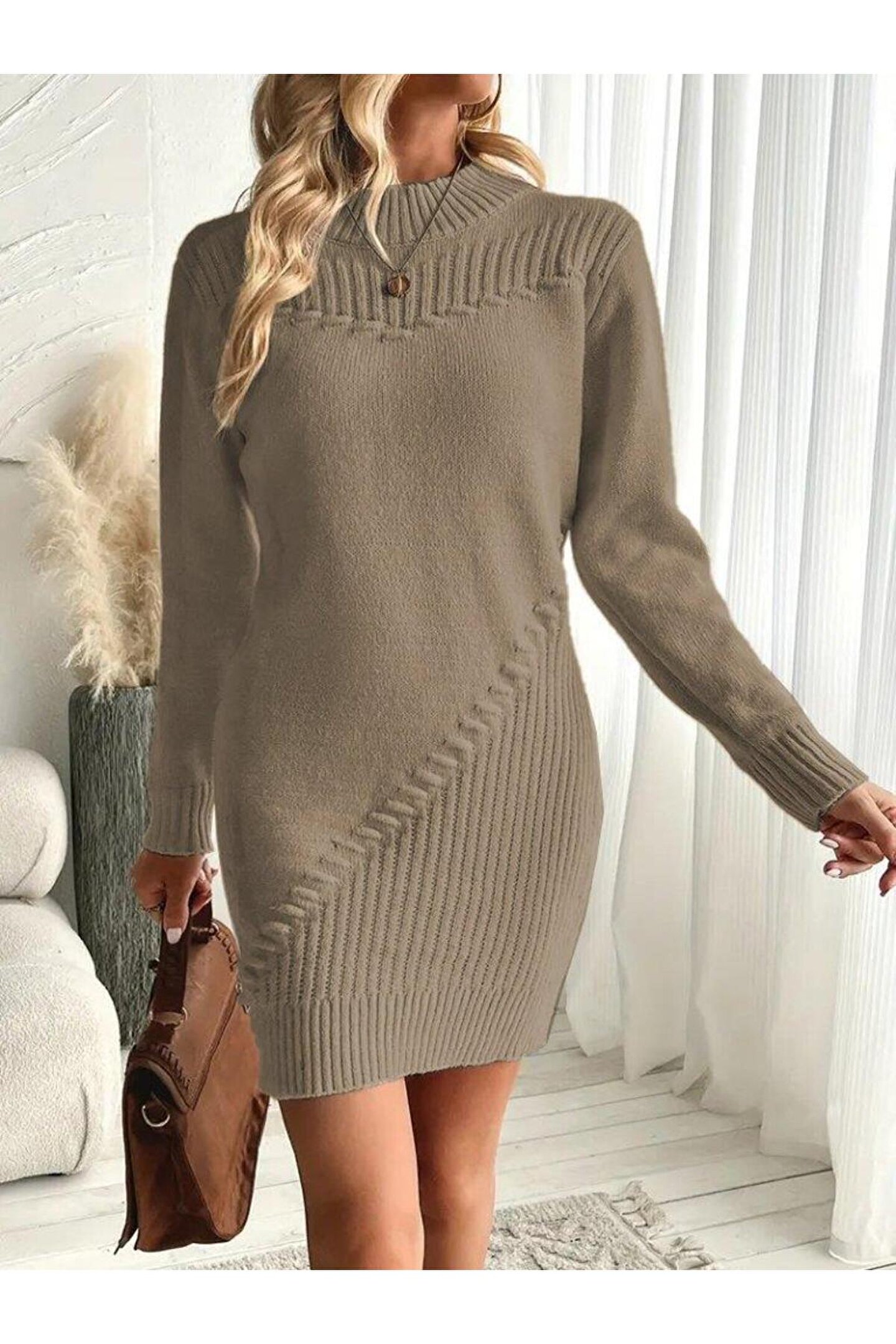 Butik Kadın Uzun Kollu Yuvarlak Yaka Mini Triko Elbise