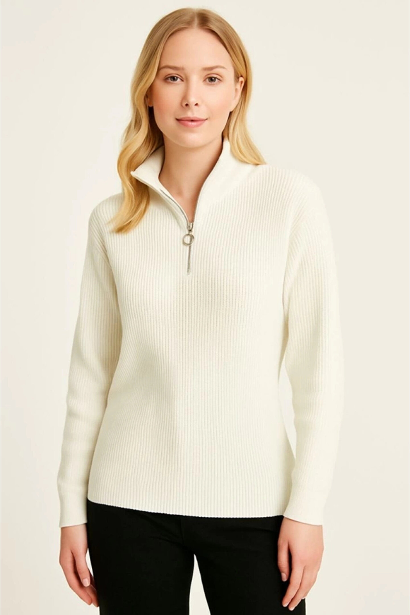 KADIN Yarım Fermuarlı Triko Kazak – Selanik Örgü, Dik Yaka, Pamuklu Dokuma, Oversize Uzun Kollu Kışlık Model - Beyaz