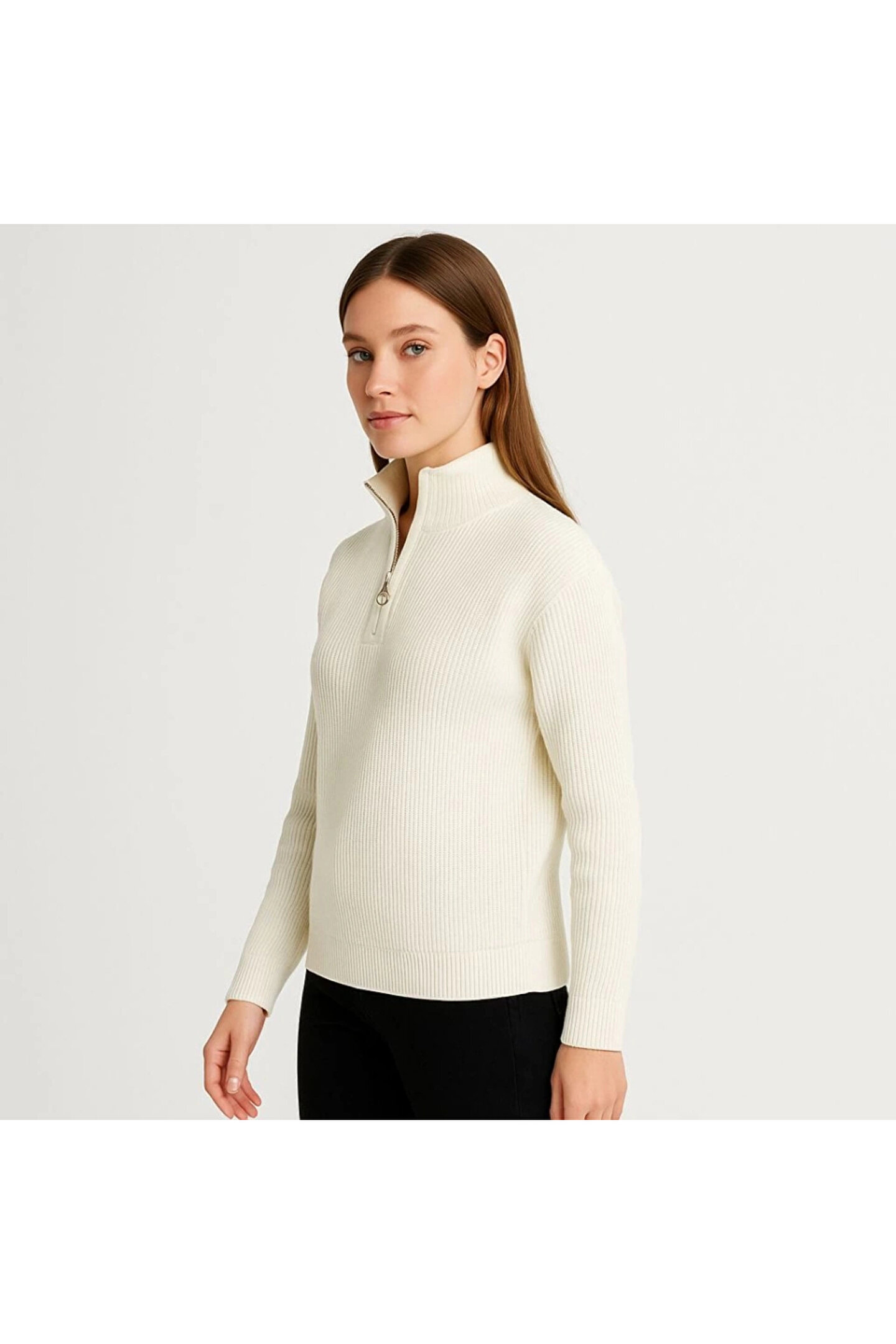 KADIN Yarım Fermuarlı Triko Kazak – Selanik Örgü, Dik Yaka, Pamuklu Dokuma, Oversize Uzun Kollu Kışlık Model - Beyaz