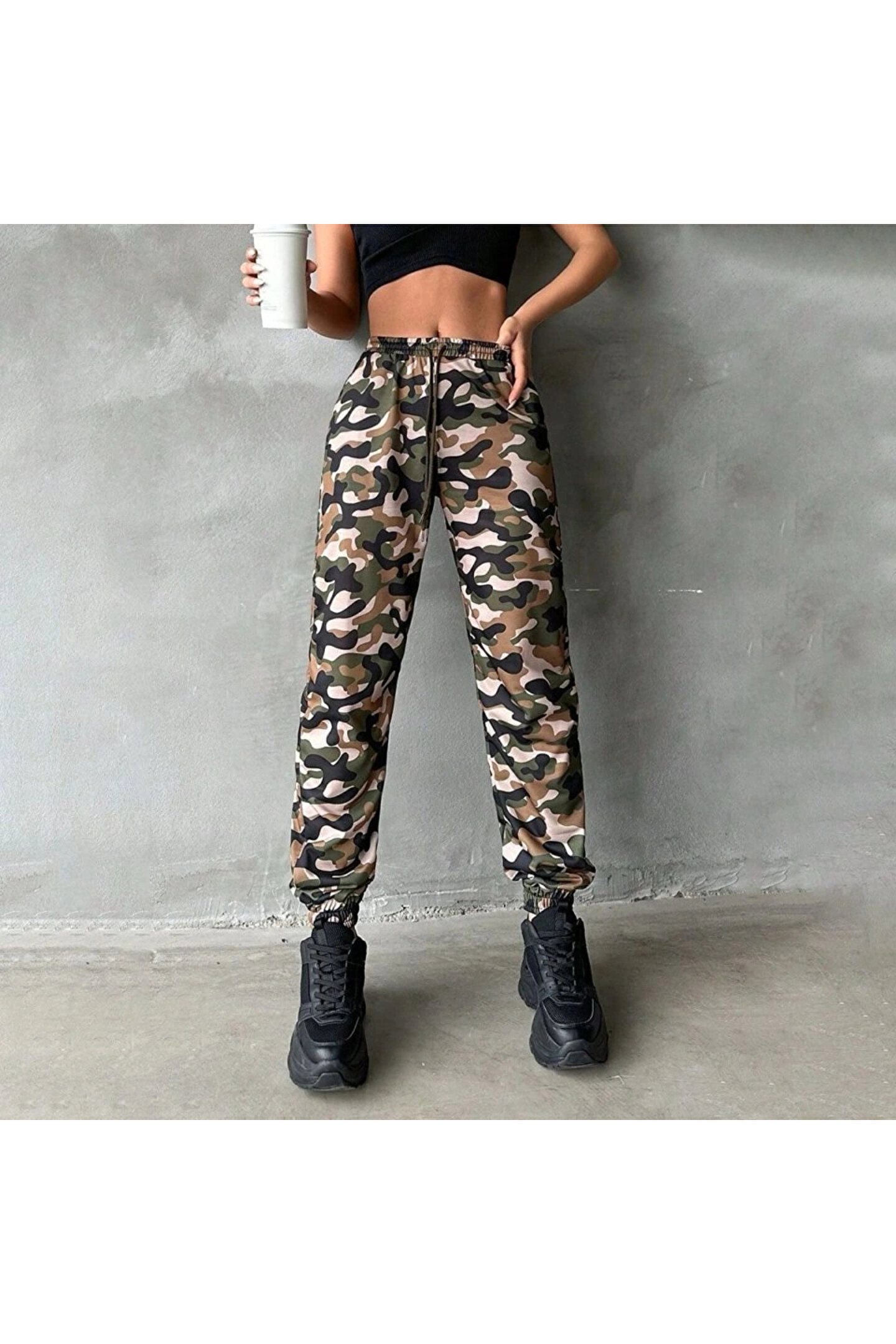 Kadın Yüksek Bel Kamuflaj Baskılı Bileği Lastik Detay İki İplik Pantolon