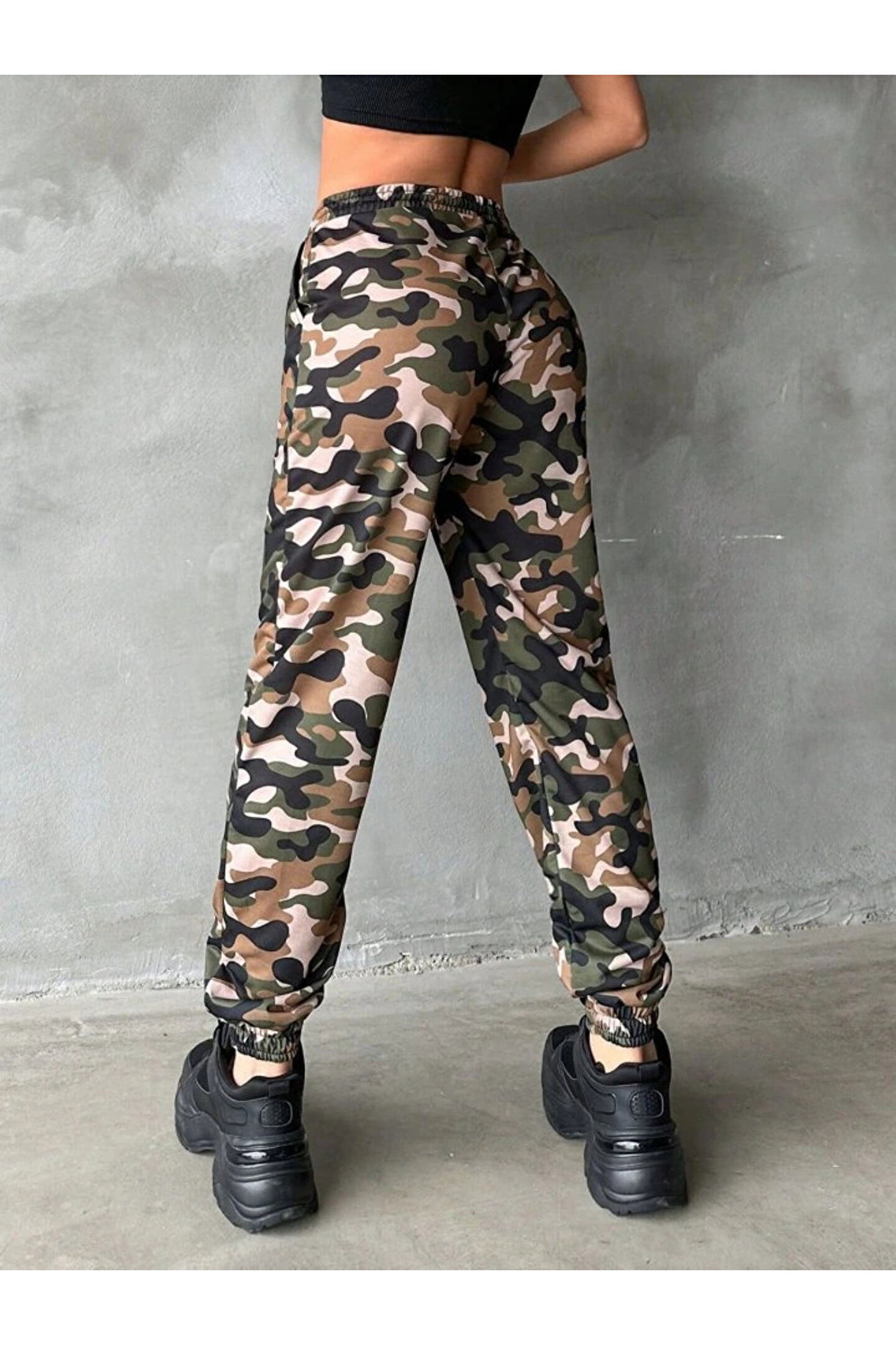 Butik Kadın Yüksek Bel Kamuflaj Baskılı Bileği Lastik Detay İki İplik Pantolon