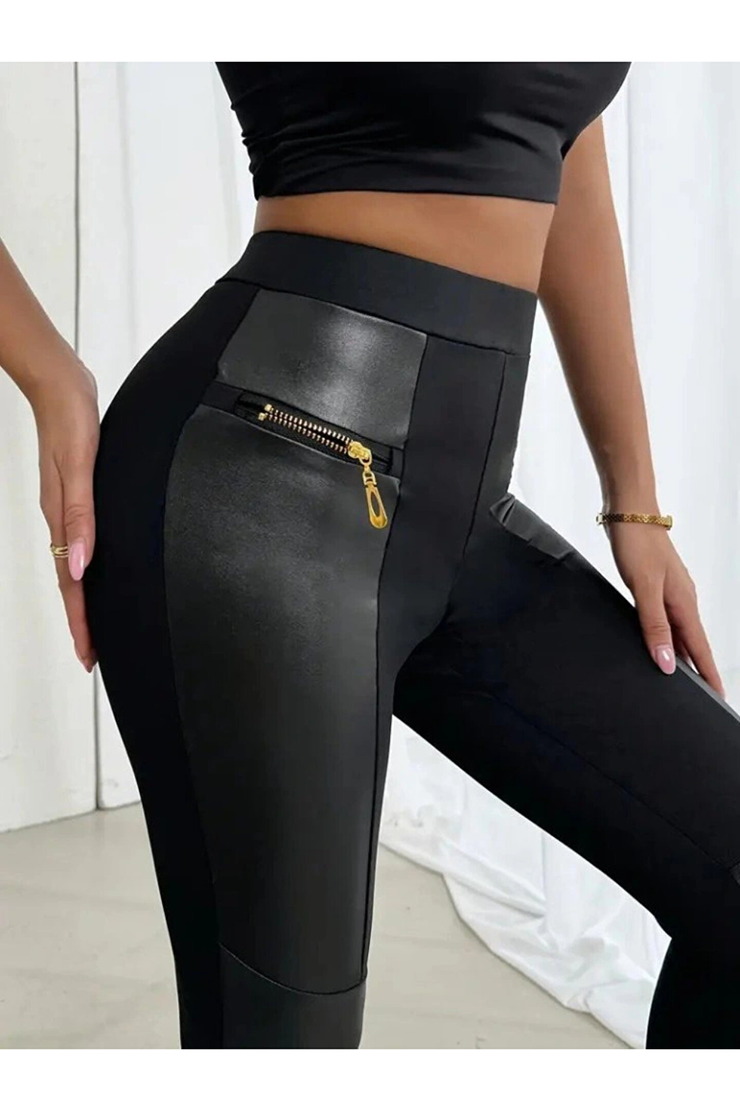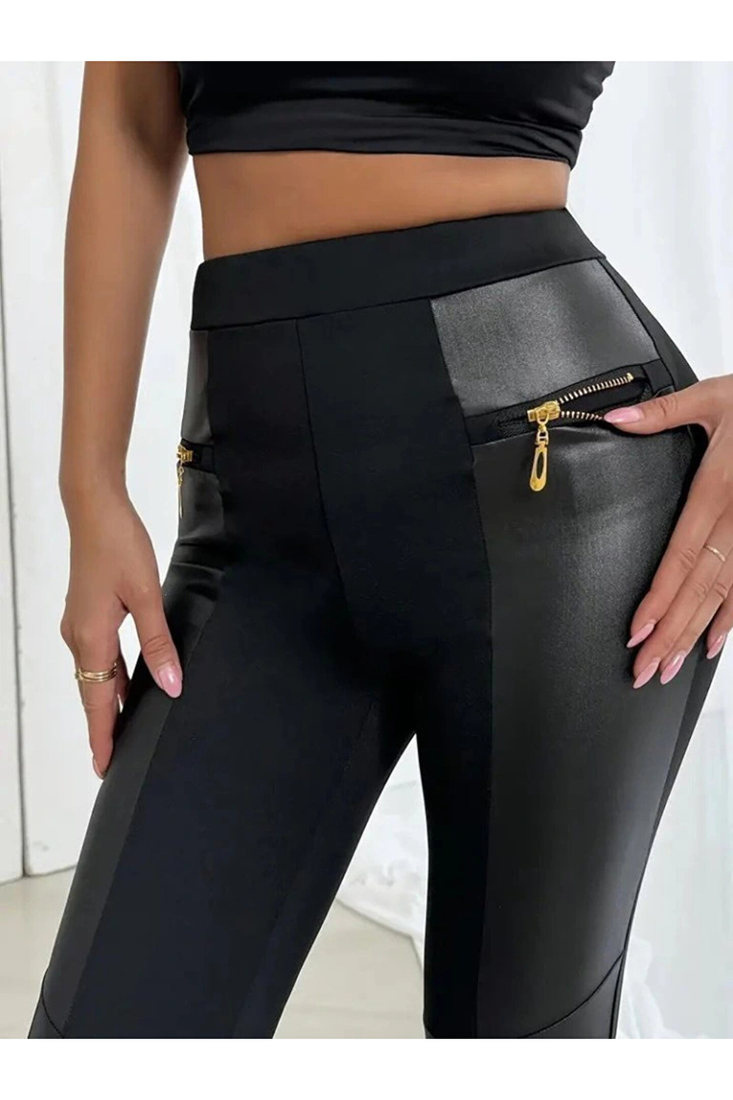 Butik Kadın Yüksek Bel Yan şerit Deri Detay Fermuarlı Dalgıç Tayt