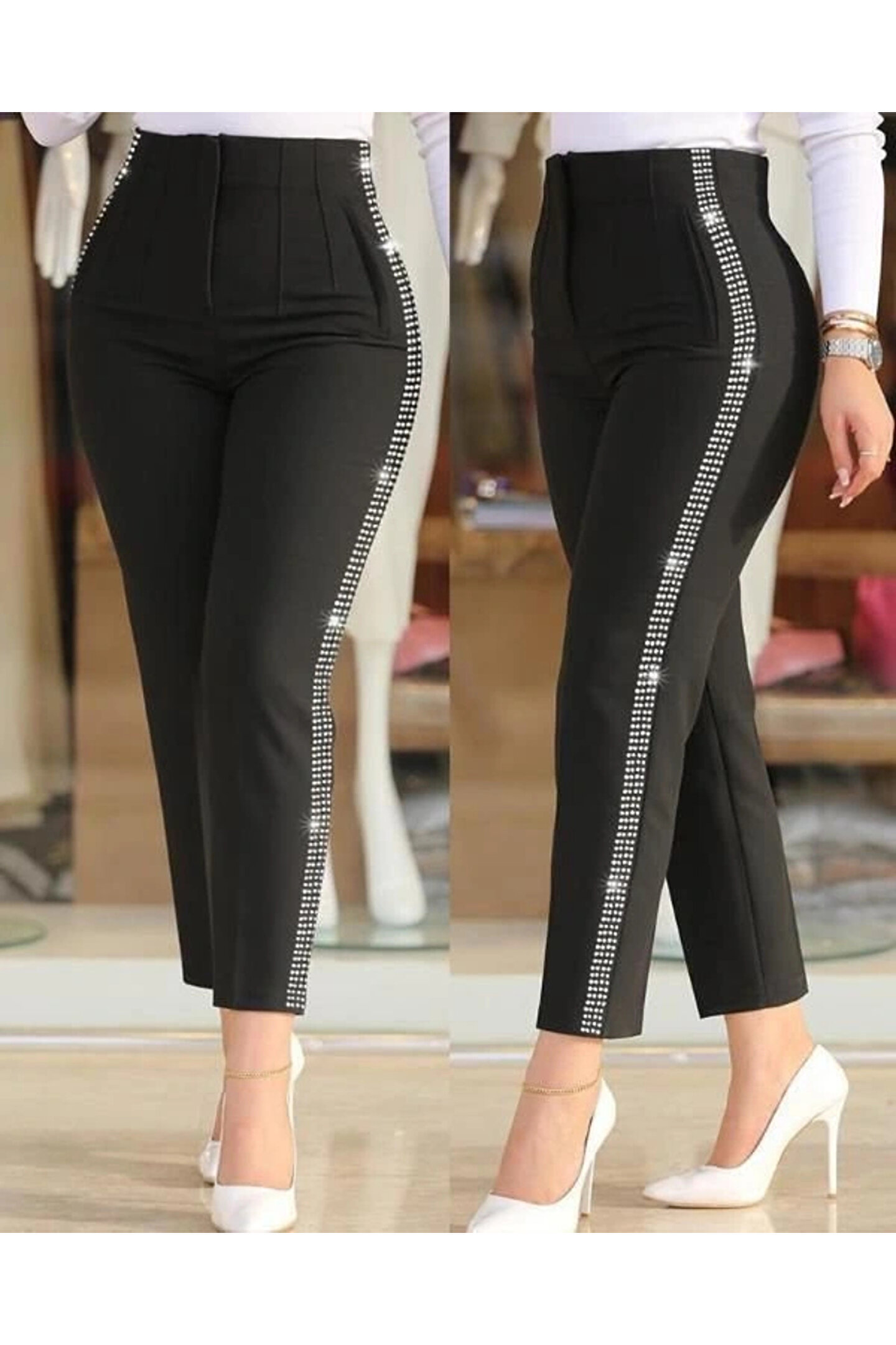 Butik Kadın Yüksek Bel Yanlardan Taş Detaylı Ithal Krep Pantolon