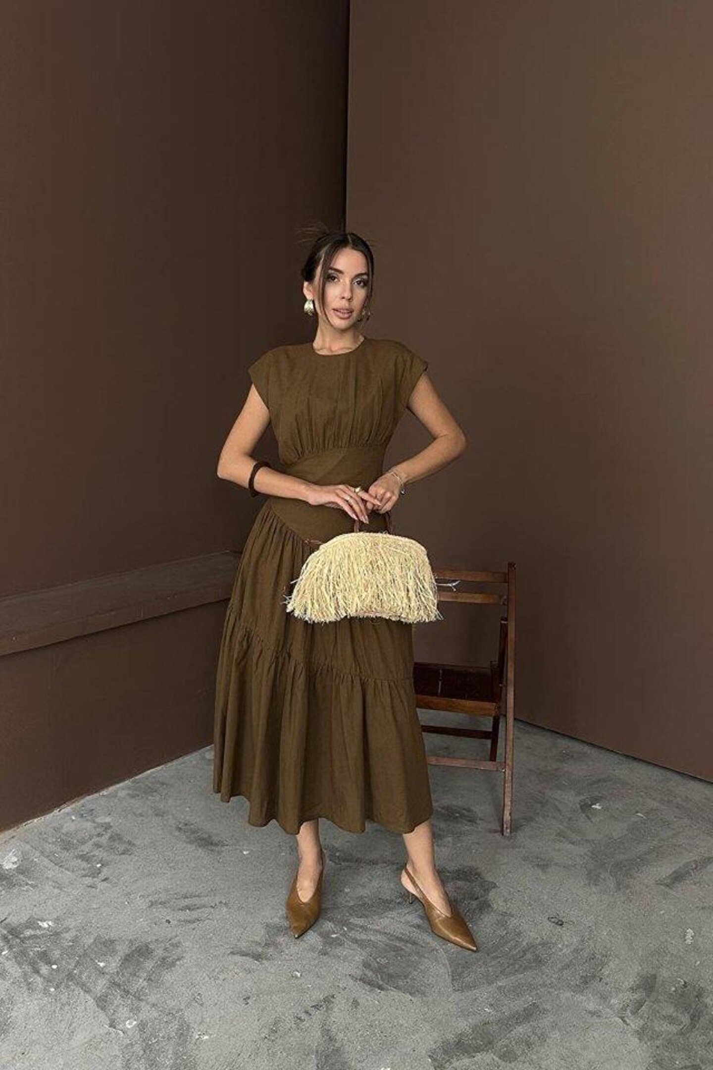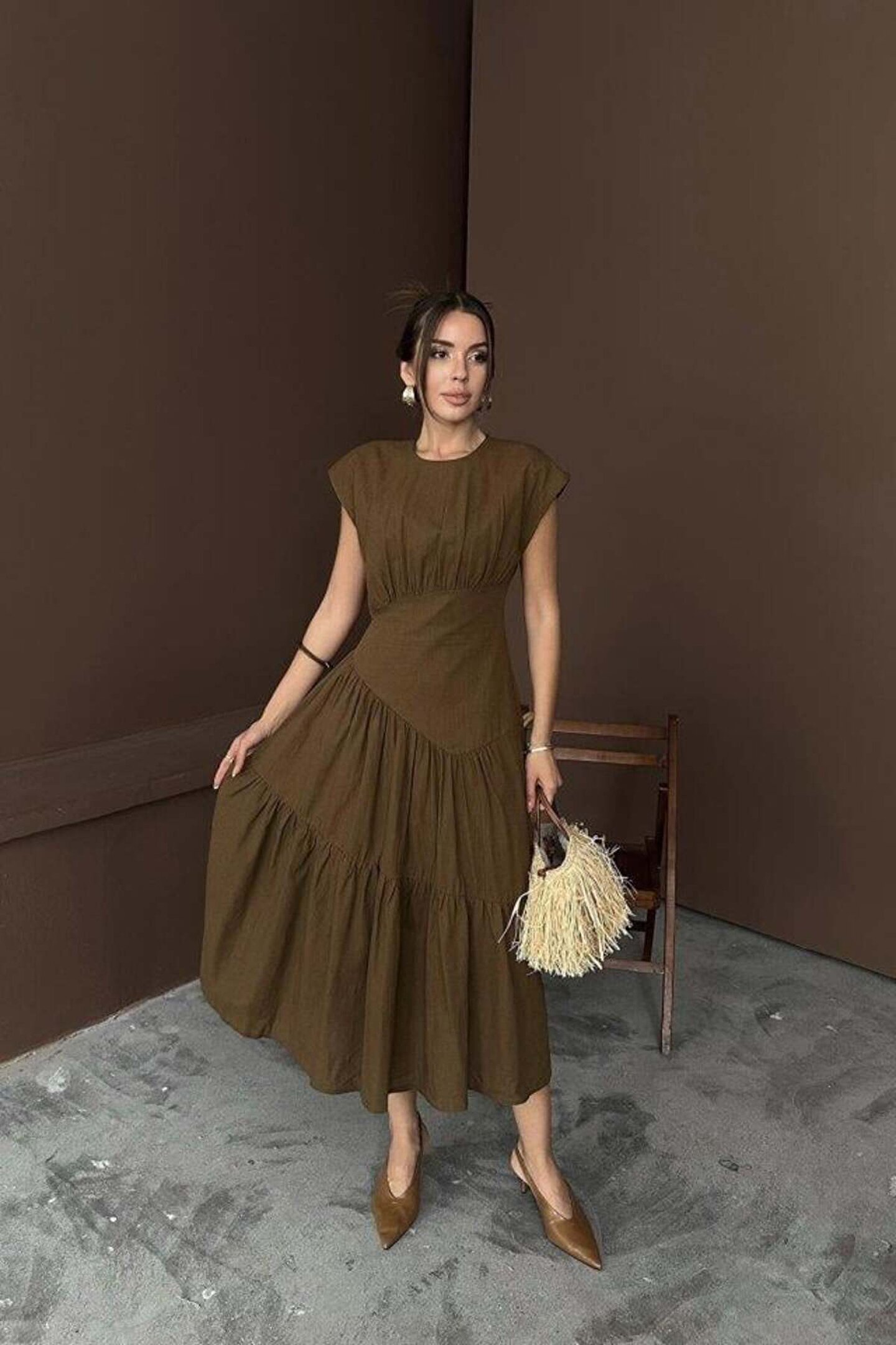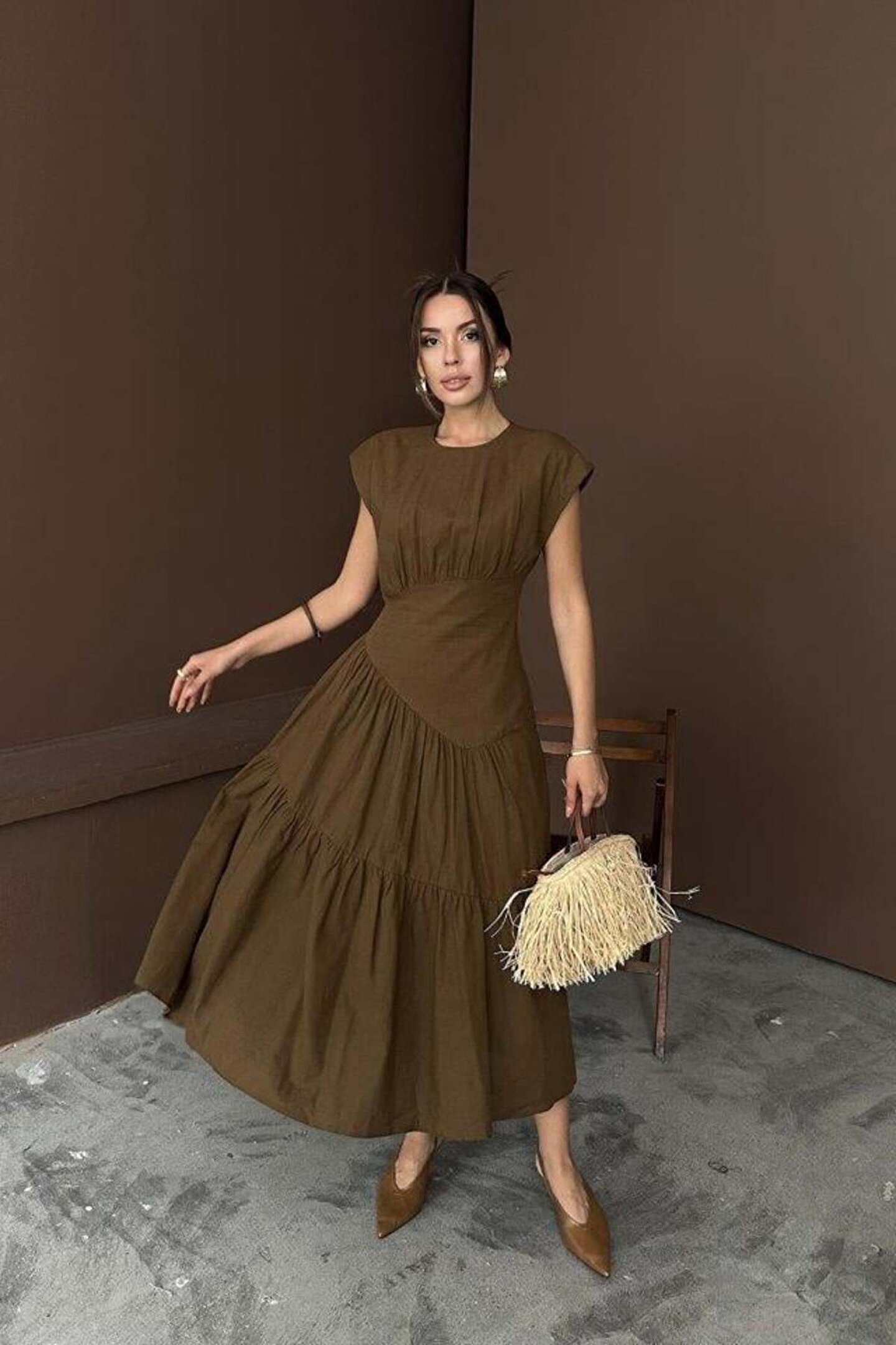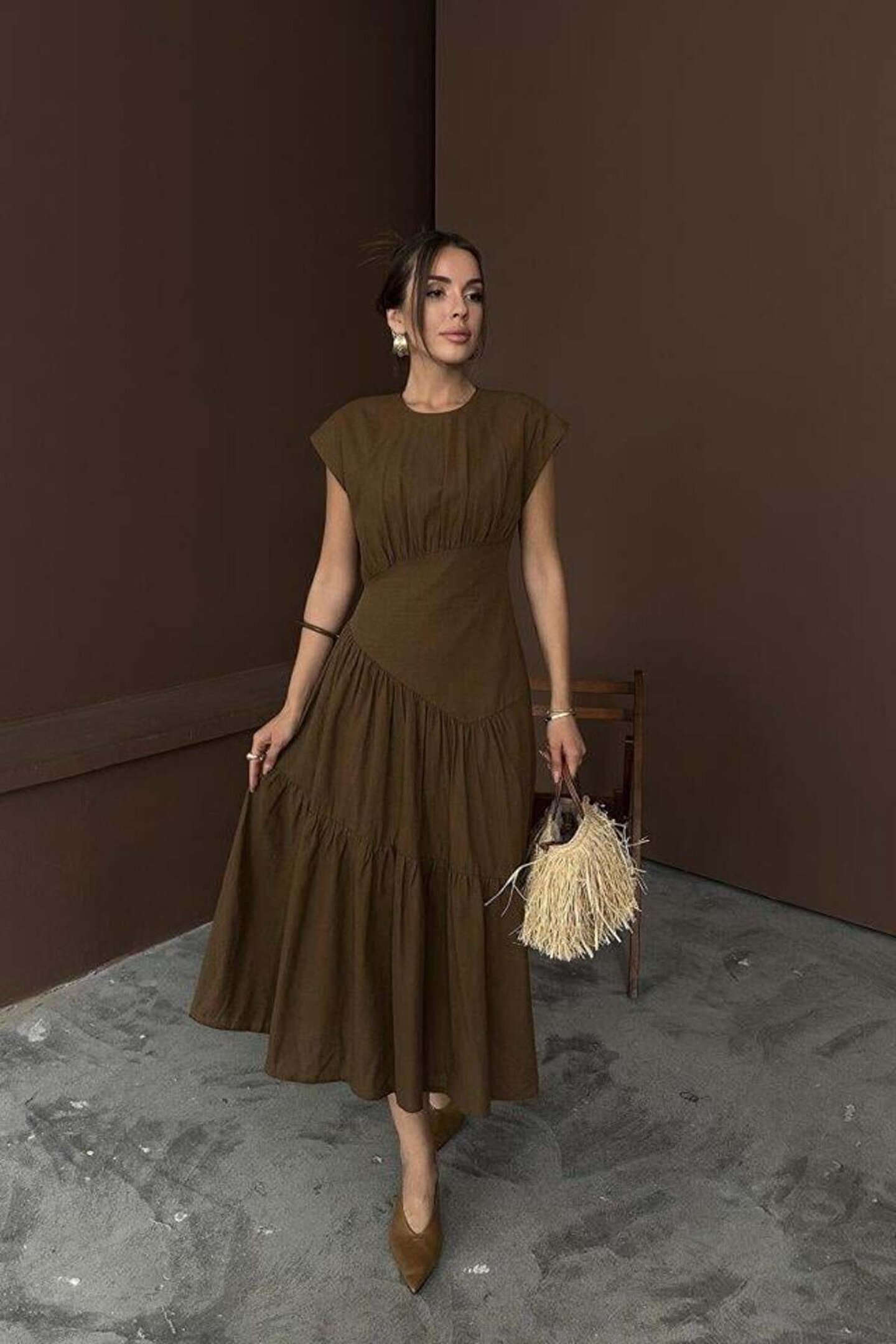 Butik Kahverengi Büzgü Detaylı Keten Elbise