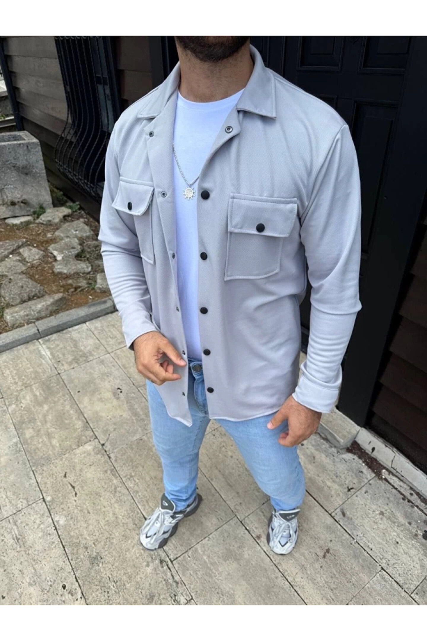 Erkek Diagonal Kumaş Cepli Çıtçıtlı Uzun Kollu, Gömlek Oversize Rahat Kalıp Günlük Şık Stil - Gri