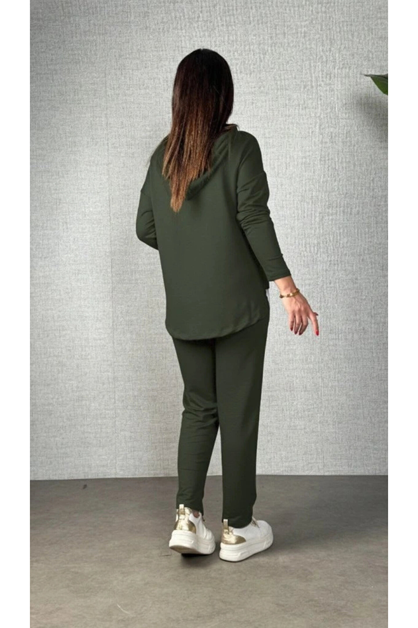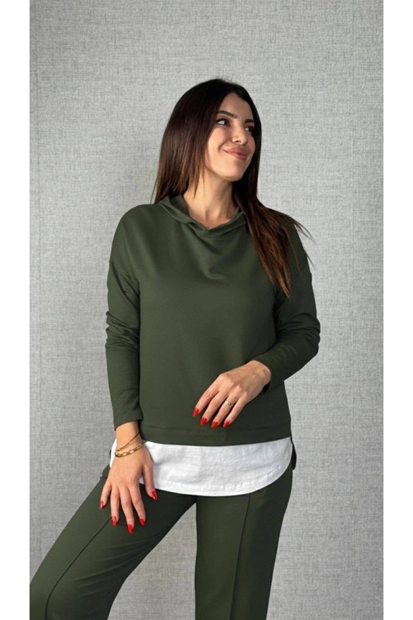 Kadın Uzun Kollu Kapşonlu Bağcıklı Viskon Iki Iplik Bluz Ve Pantolon Ikili Takım