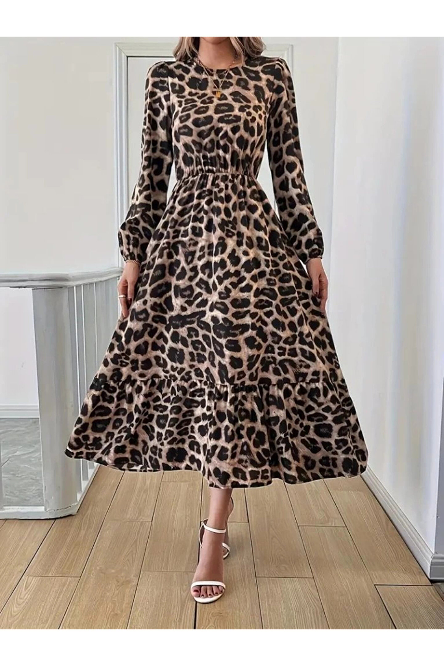 Butik MDB Uzun Kollu Bisiklet Yaka Leopar Desenli Midi Süprem Elbise