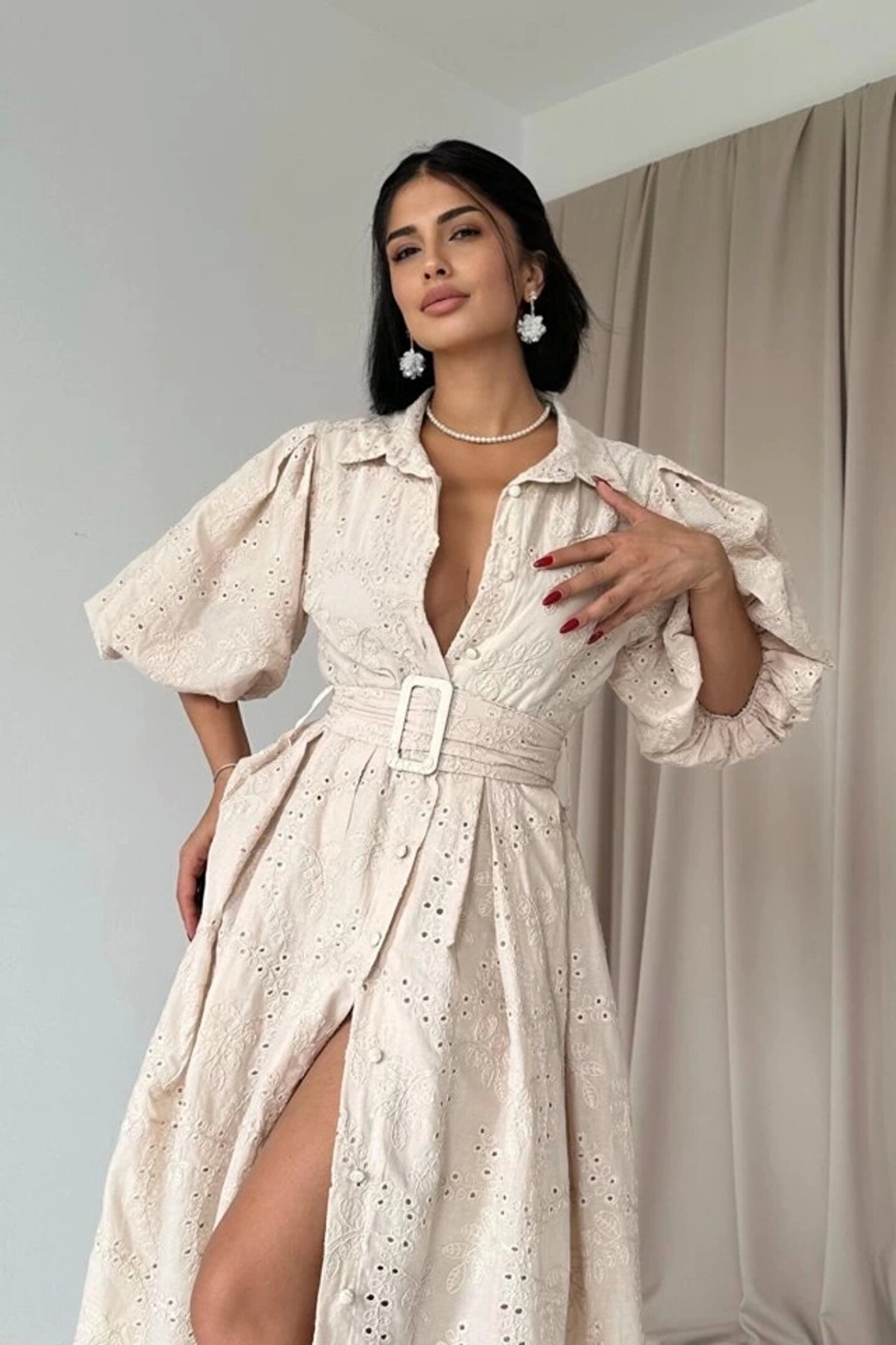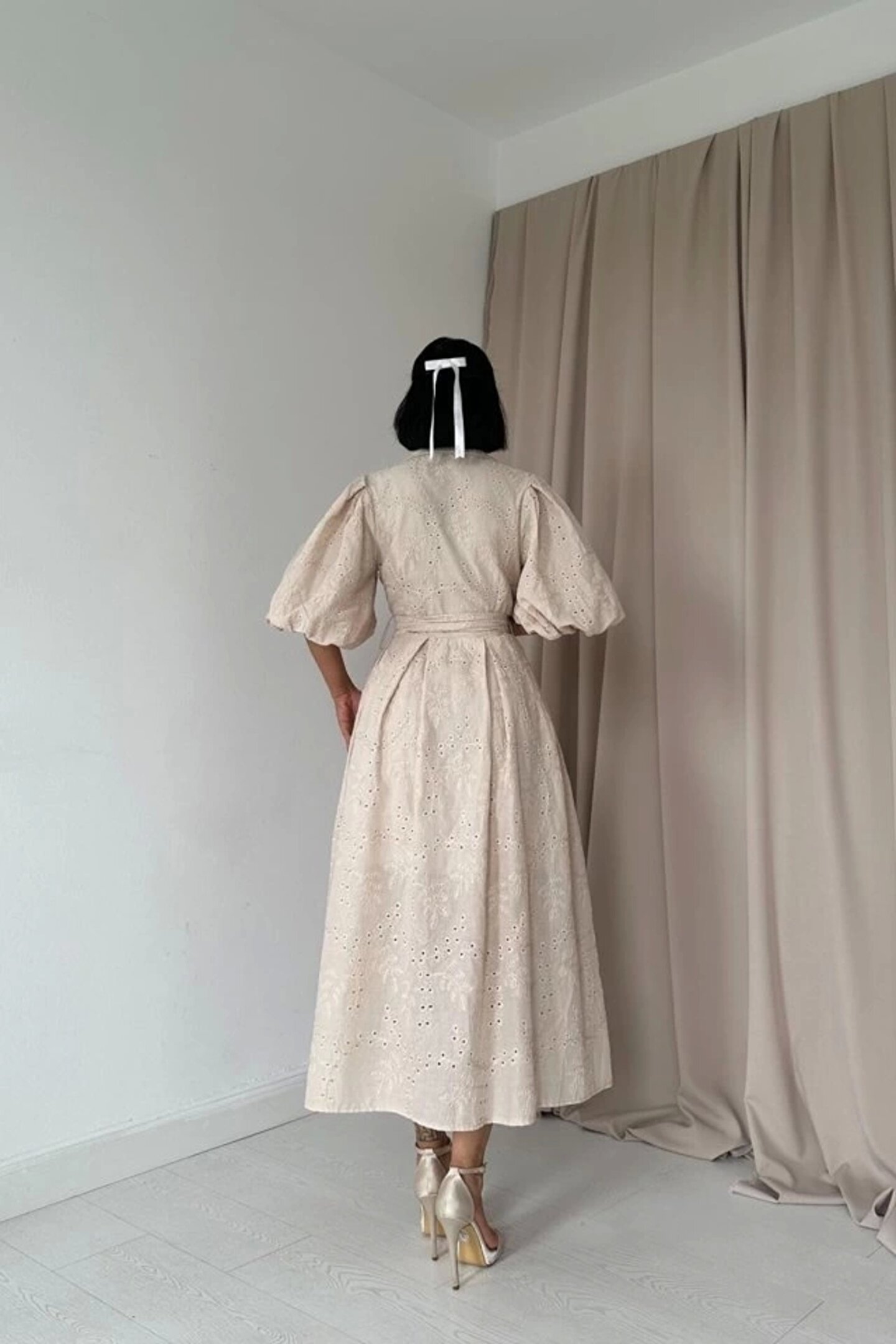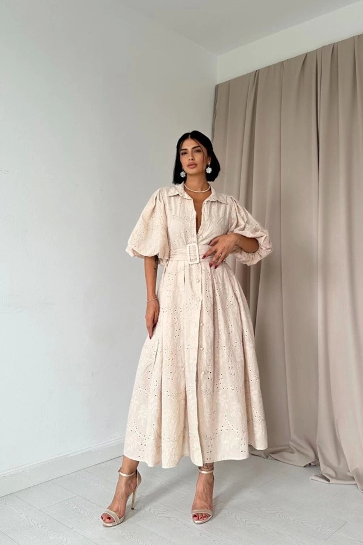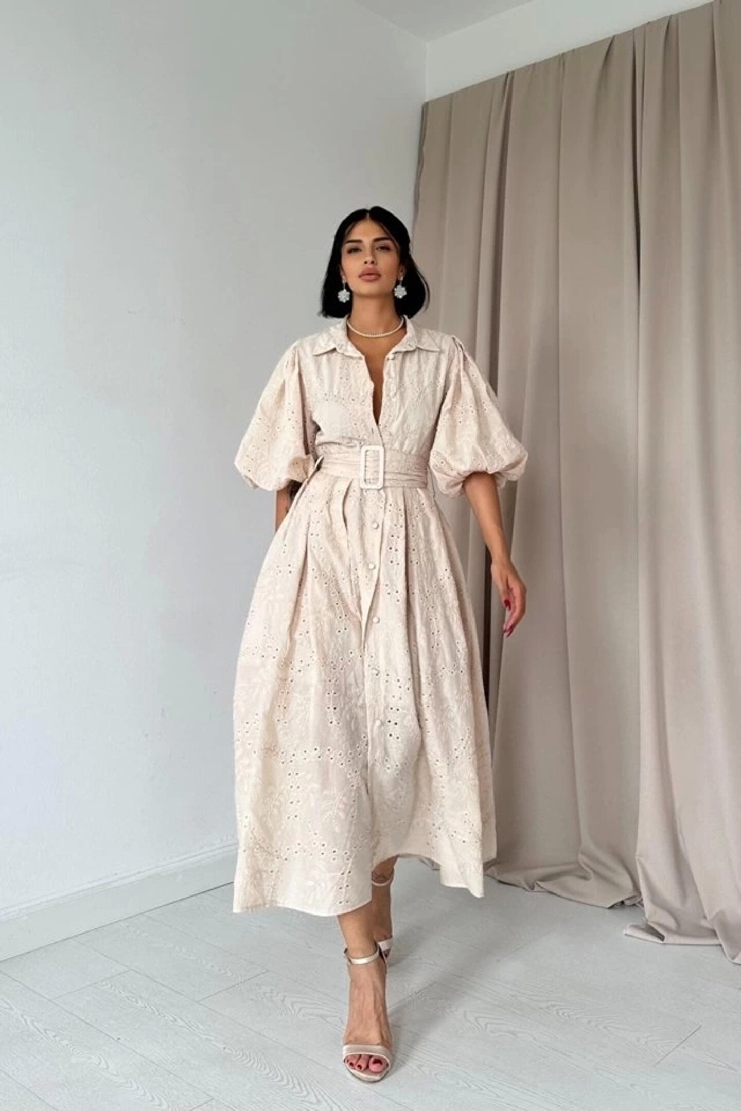 Bej Pileli Balkon Elbise