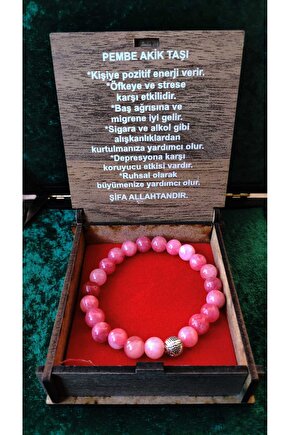 Doğal akik taşı kullanılarak üretilmiş, şıklığı ve zarafeti bir arada sunan bileklik; Her bir bileklik, benzersiz desenleri ve renkleriyle dikkat çeken doğal akik taşlardan özenle seçilmiştir; Doğal taş materyali sayesinde, her bileklik eşsiz bir dokunuşla öne çıkar ve cildinizle doğal bir uyum sağlar; Pembe akik taşı, bilekliklere canlılık katarak günlük kullanım için ideal bir aksesuar seçeneği sunar;