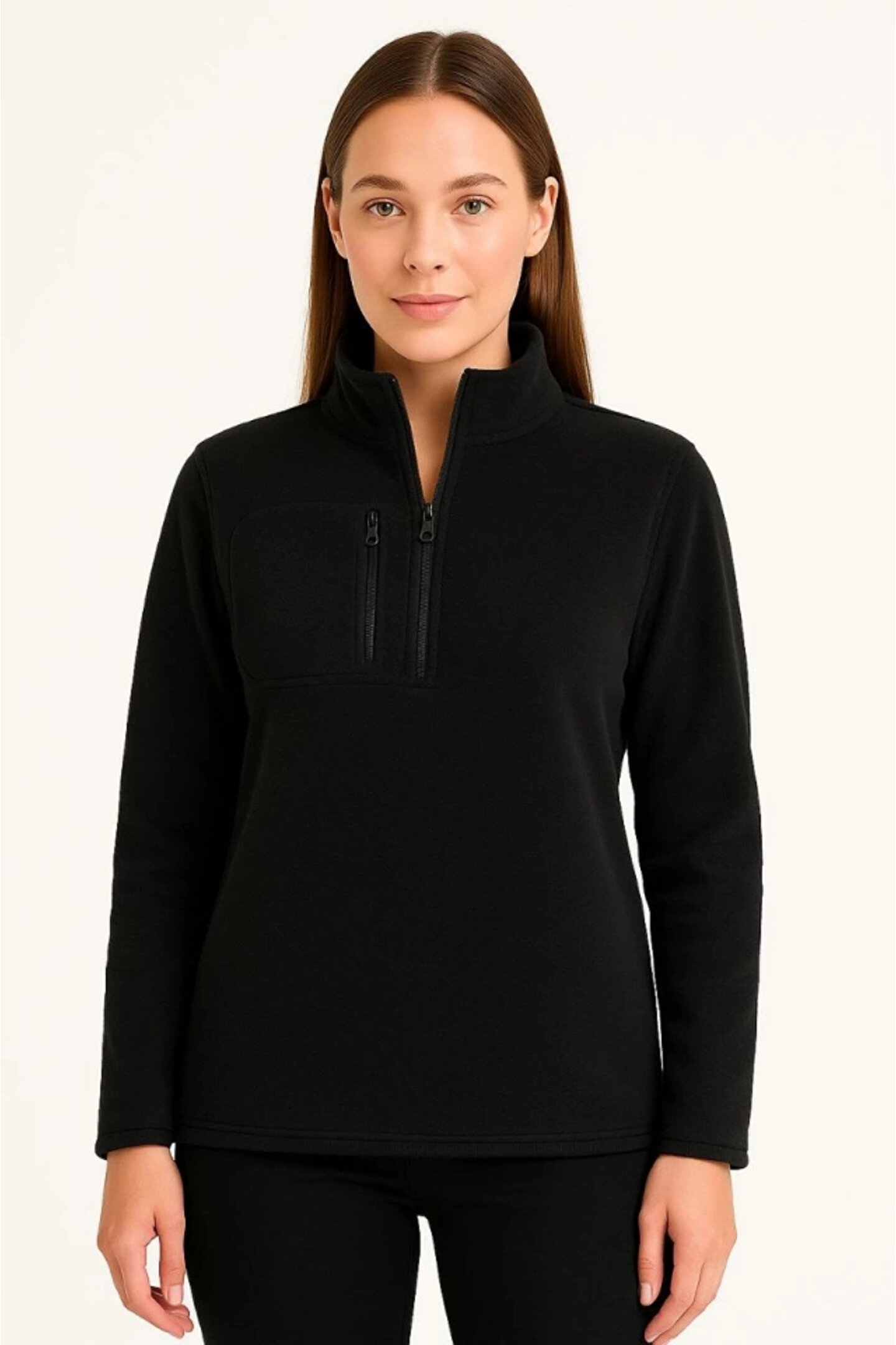 Butik Polar Kazak – Dik Yaka, Yarım Fermuarlı, Fermuarlı Göğüs Cepli, Siyah Biyeli, Kışlık Rahat Regular F