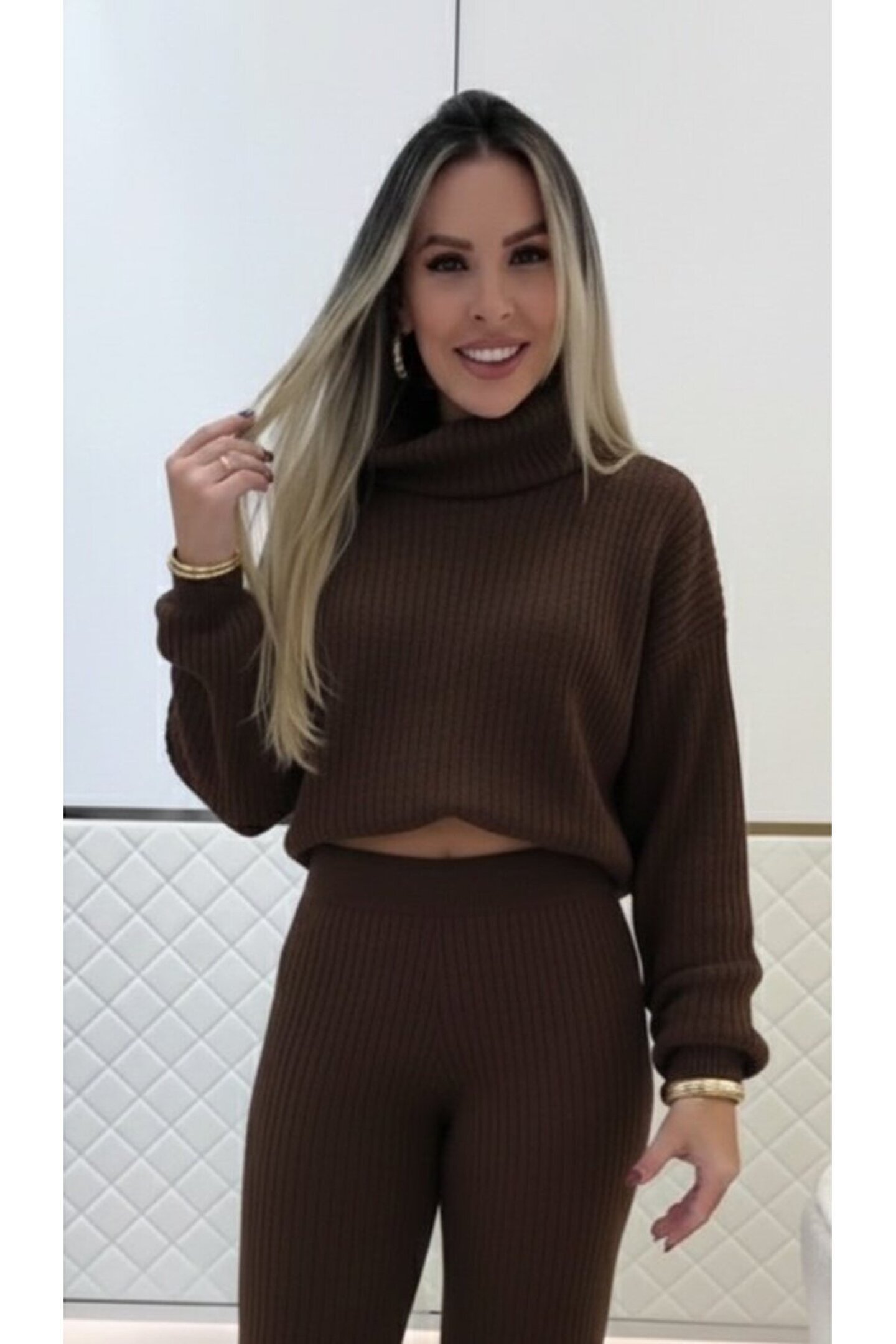 Butik Turega Style Kadın Uzun Kollu Balıkçı Yaka Kısa Triko Bluz Ve Pantolon Ikili Takım