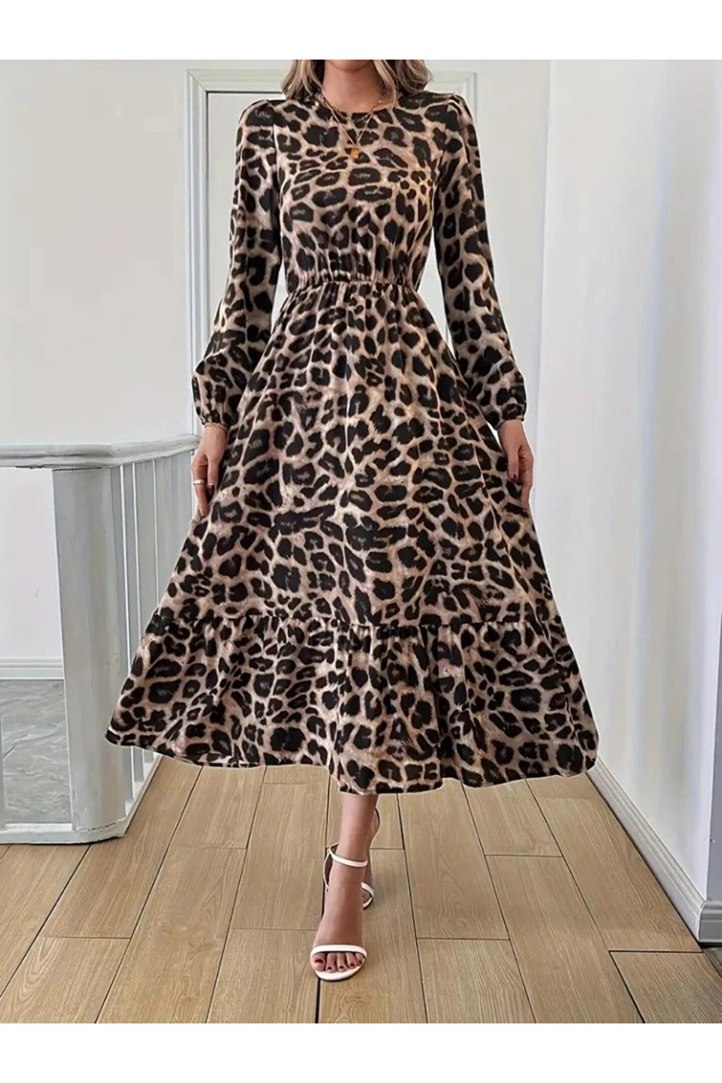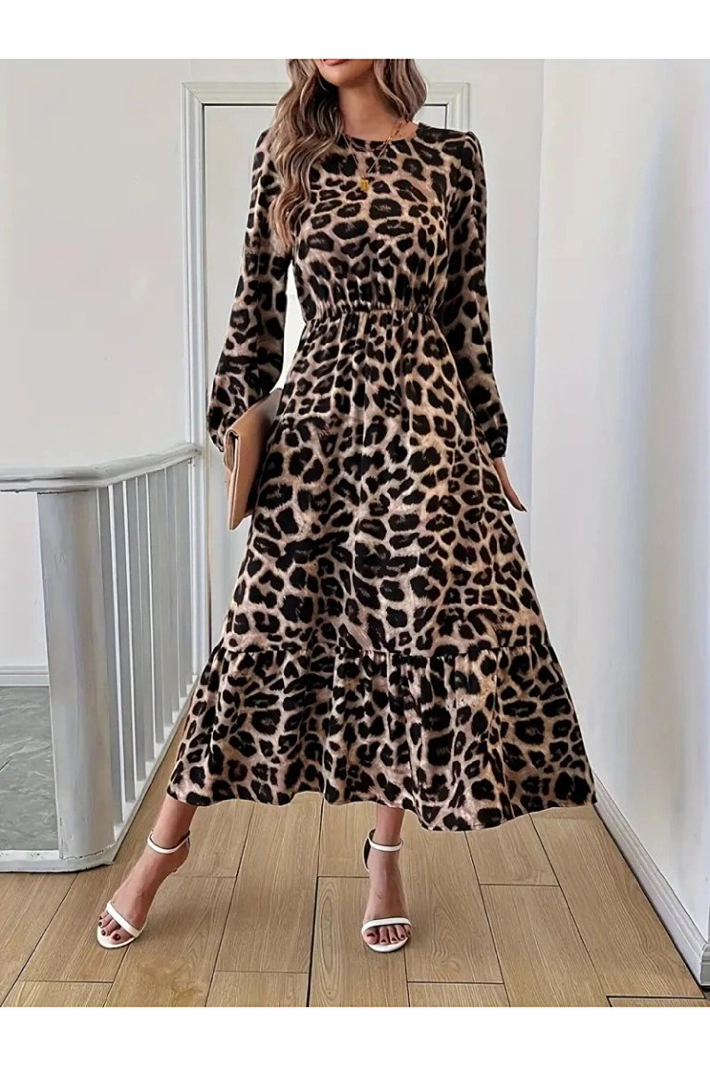 Uzun Kollu Bisiklet Yaka Leopar Desenli Midi Süprem Elbise