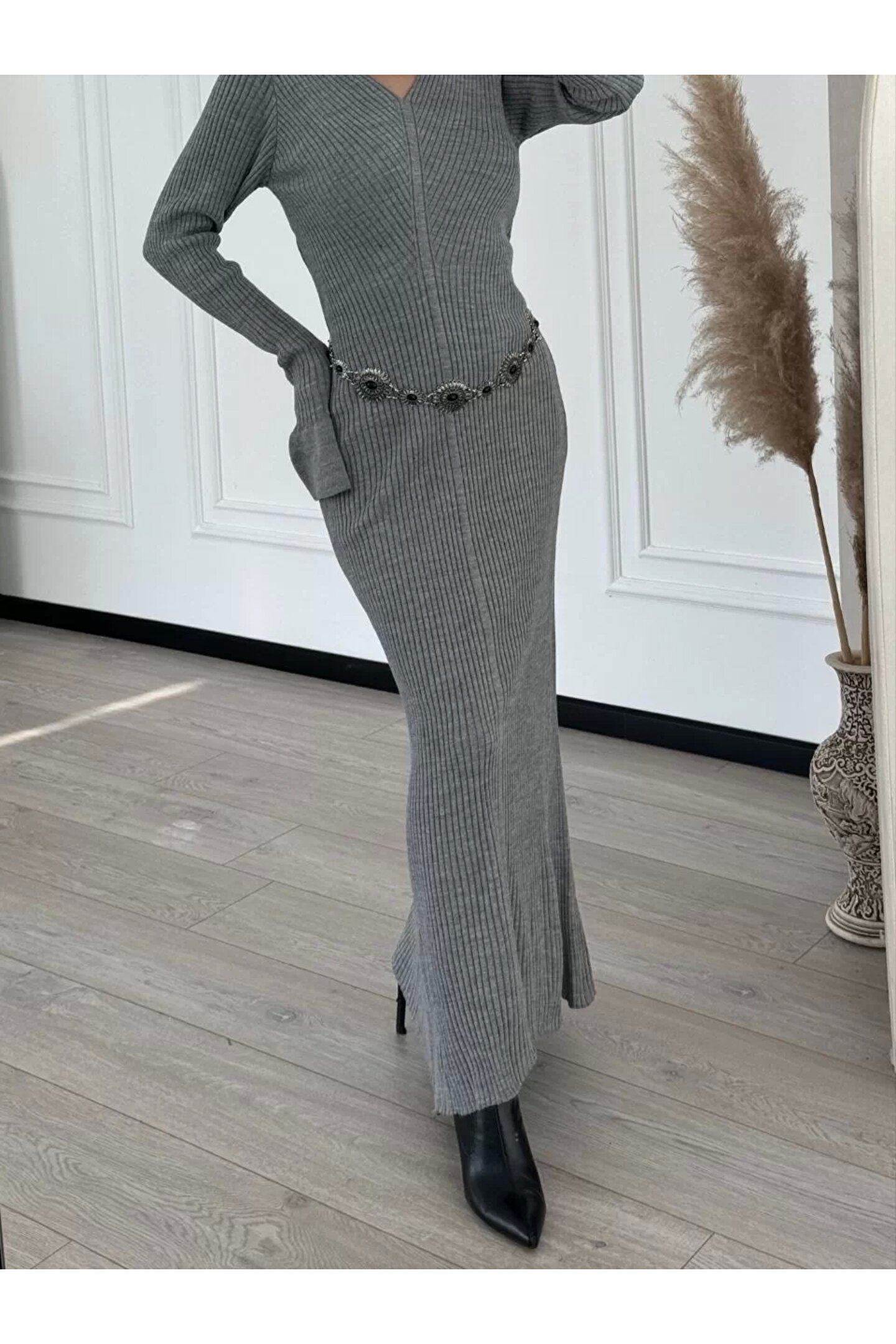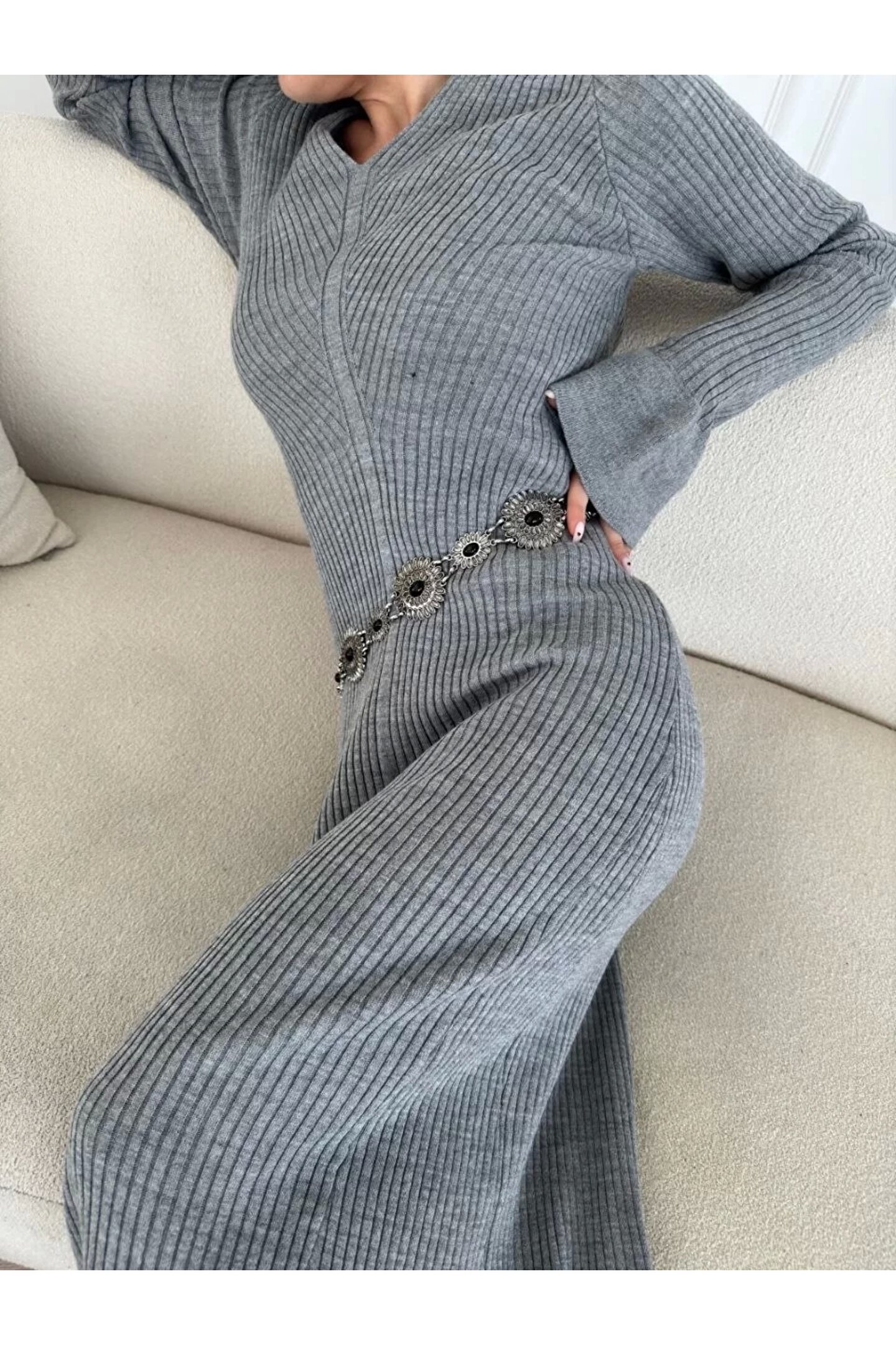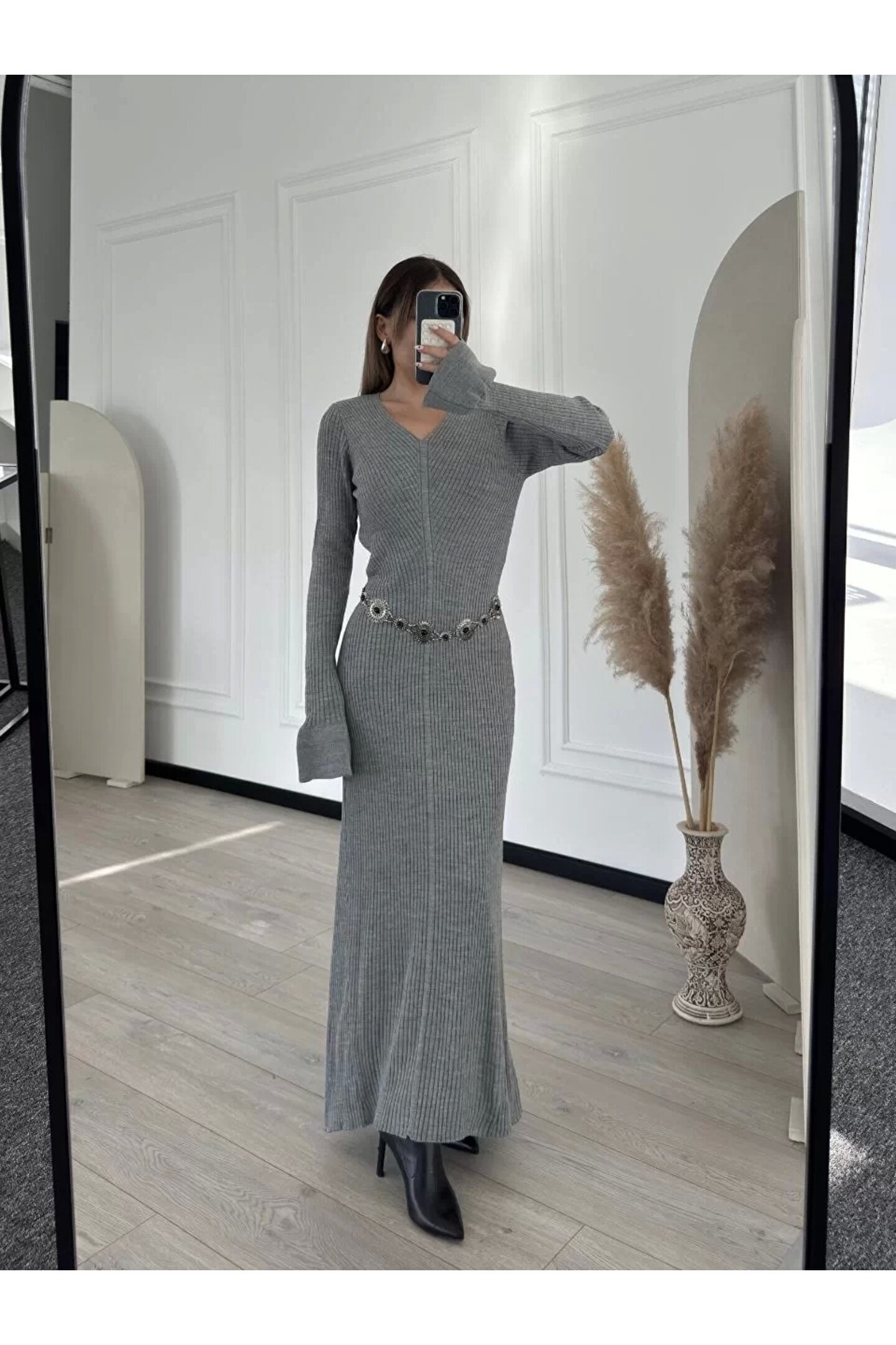 - Klasik ve zamansız bir görünüm için gri renkteki fitilli triko kumaş kullanılmıştır.; - V yaka tasarımı ile modern ve şık bir siluet sunar.; - Uzun kollu yapısı, soğuk havalarda bile konforlu bir kullanım sağlar.; - Kemer detayları bel bölgesini vurgulayarak feminen bir duruş kazandırır.; - Düz deseniyle kolayca kombinlenebilir ve her ortama uyum sağlar.; - Regular kalıp, rahat bir oturuş sunarken vücut hatlarını nazikçe sarar.; - Pamuklu materyali sayesinde nefes alabilir yapıda olup gün boyu rahatlık sunar.; - Uzun boyu ile hem günlük hem de özel günlerde tercih edilebilir.; - Trend bir görünüm için idealdir; stil sahibi kadınların gardırobunda yerini almayı hak eder.; - Türkiye menşeli olup, yerel üretimden kaliteli bir seçimdir.