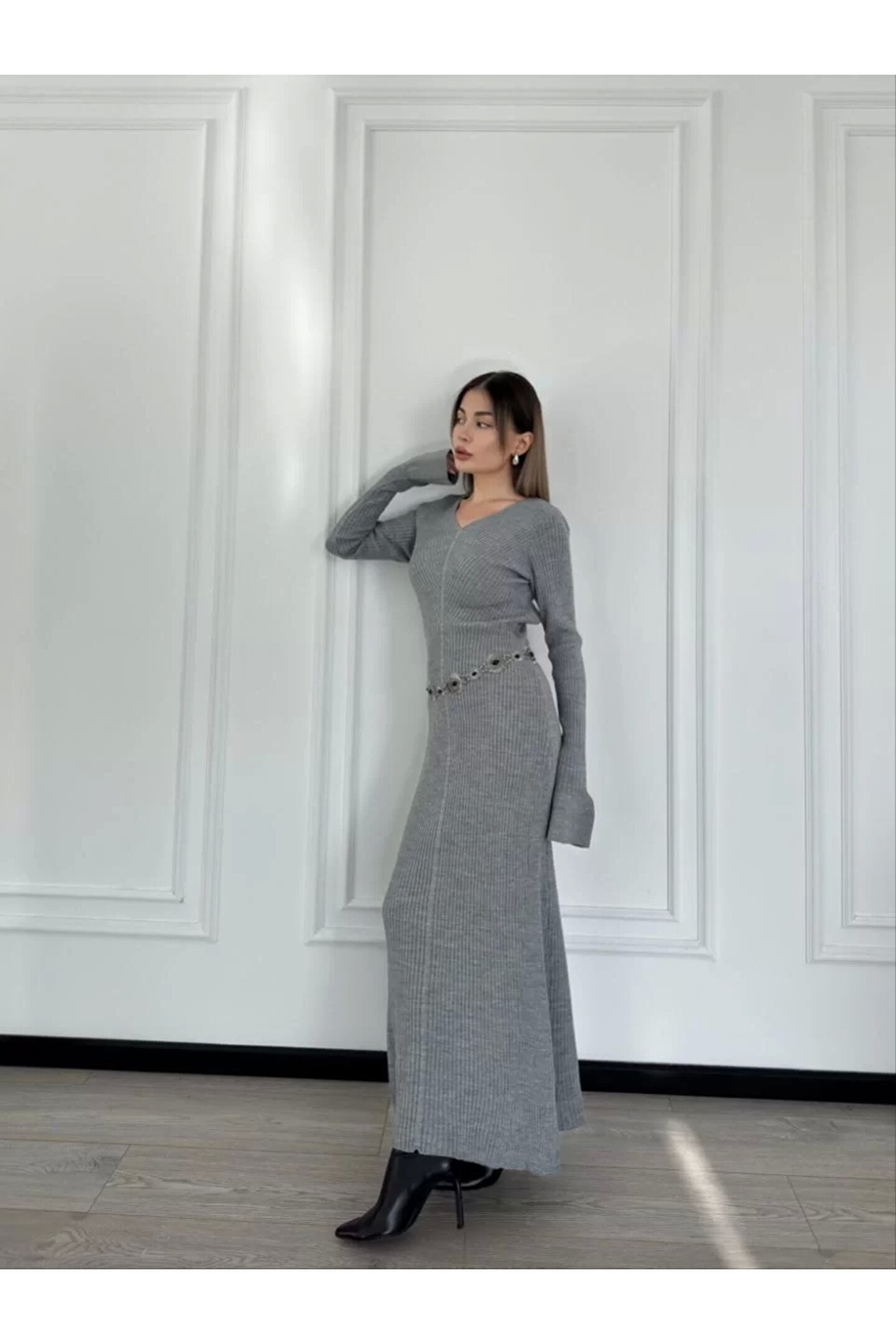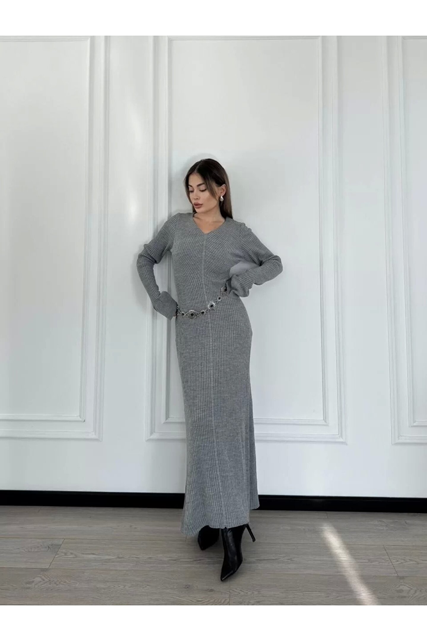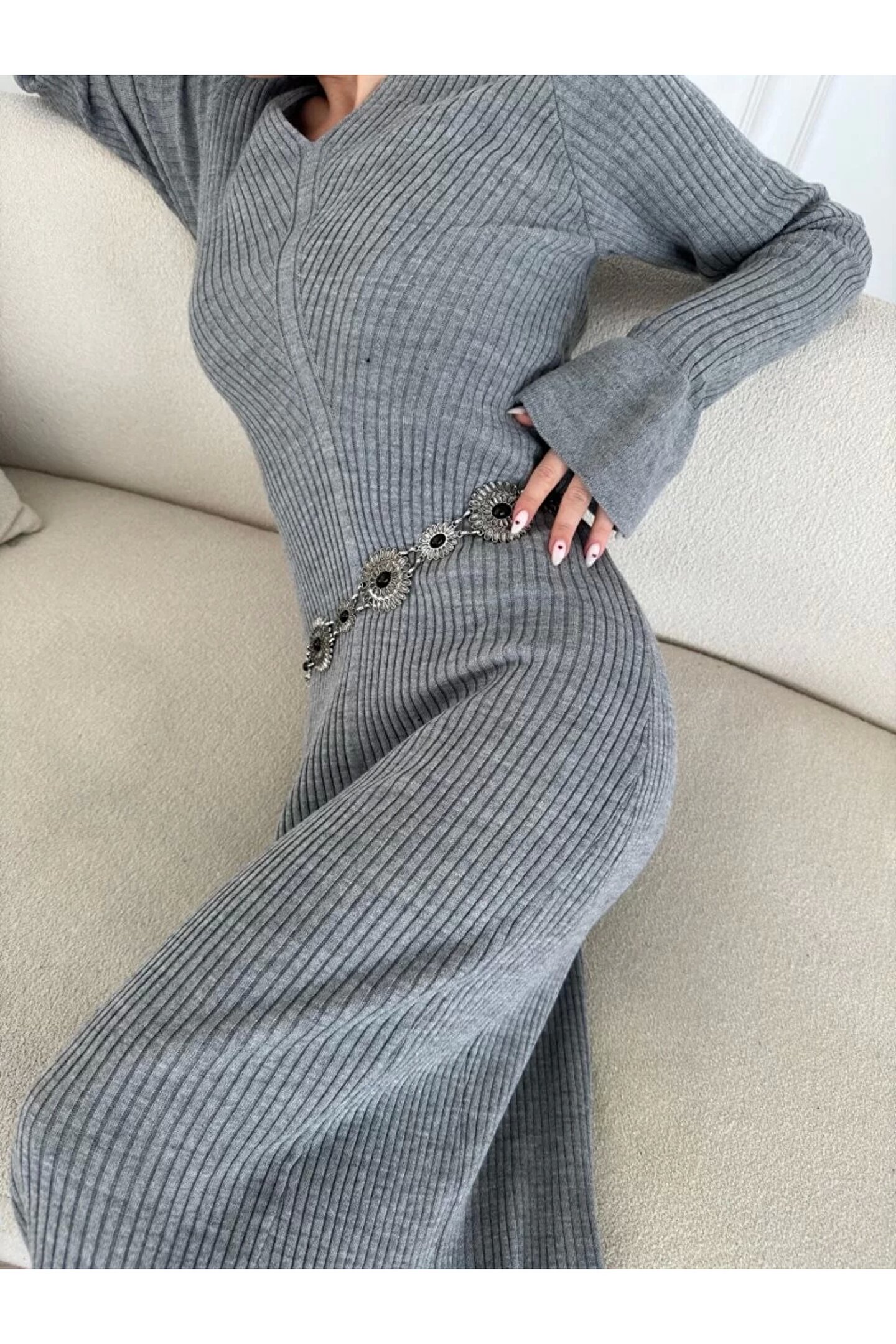 - Klasik ve zamansız bir görünüm için gri renkteki fitilli triko kumaş kullanılmıştır.; - V yaka tasarımı ile modern ve şık bir siluet sunar.; - Uzun kollu yapısı, soğuk havalarda bile konforlu bir kullanım sağlar.; - Kemer detayları bel bölgesini vurgulayarak feminen bir duruş kazandırır.; - Düz deseniyle kolayca kombinlenebilir ve her ortama uyum sağlar.; - Regular kalıp, rahat bir oturuş sunarken vücut hatlarını nazikçe sarar.; - Pamuklu materyali sayesinde nefes alabilir yapıda olup gün boyu rahatlık sunar.; - Uzun boyu ile hem günlük hem de özel günlerde tercih edilebilir.; - Trend bir görünüm için idealdir; stil sahibi kadınların gardırobunda yerini almayı hak eder.; - Türkiye menşeli olup, yerel üretimden kaliteli bir seçimdir.