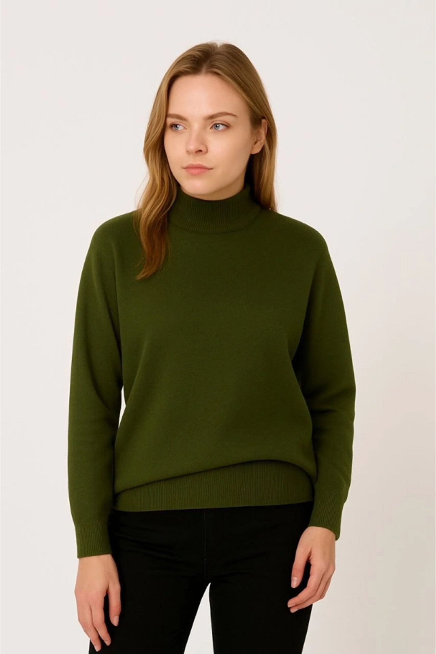 Butik Yarım Boğaz Triko Kazak Yumuşak Dokulu Pamuklu Ince Dokuma, Uzun Kollu Rahat Regular Kalıp - Haki