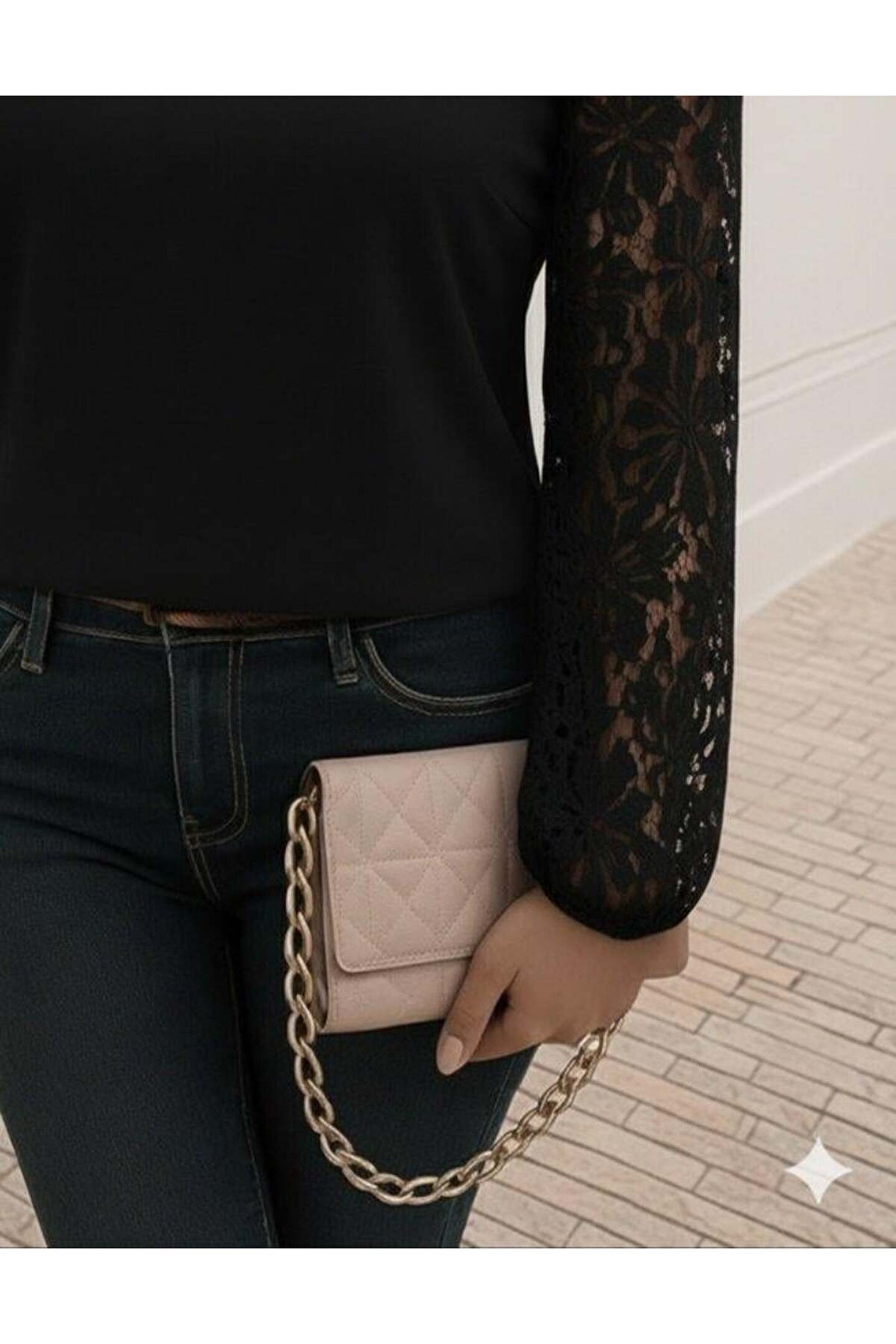 By Sevilen Collection Kadın Uzun Kollu Asimetrik Yakalı Dantelli Ithal Krep Bluz