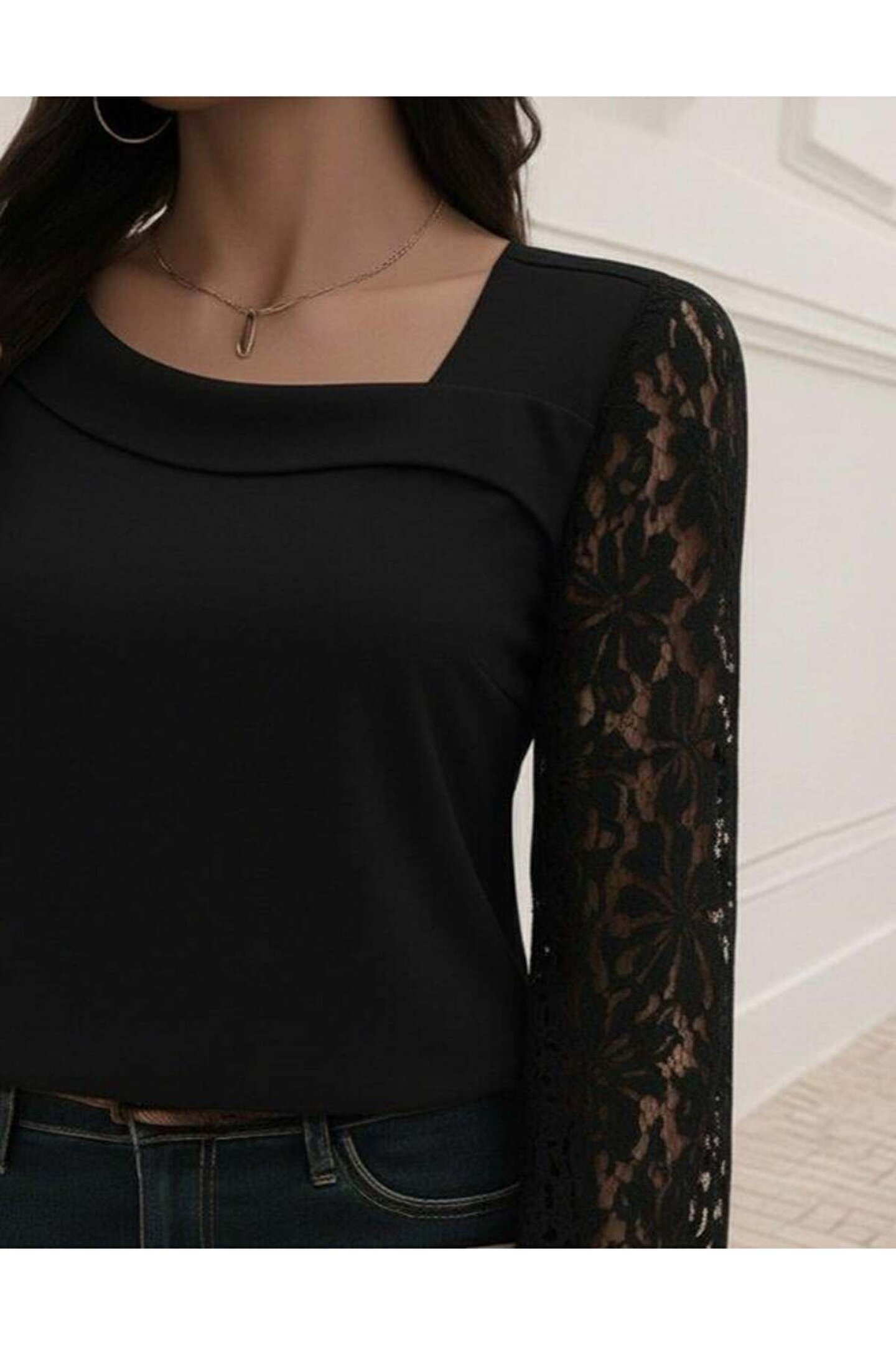 Kadın Uzun Kollu Asimetrik Yakalı Dantelli Ithal Krep Bluz