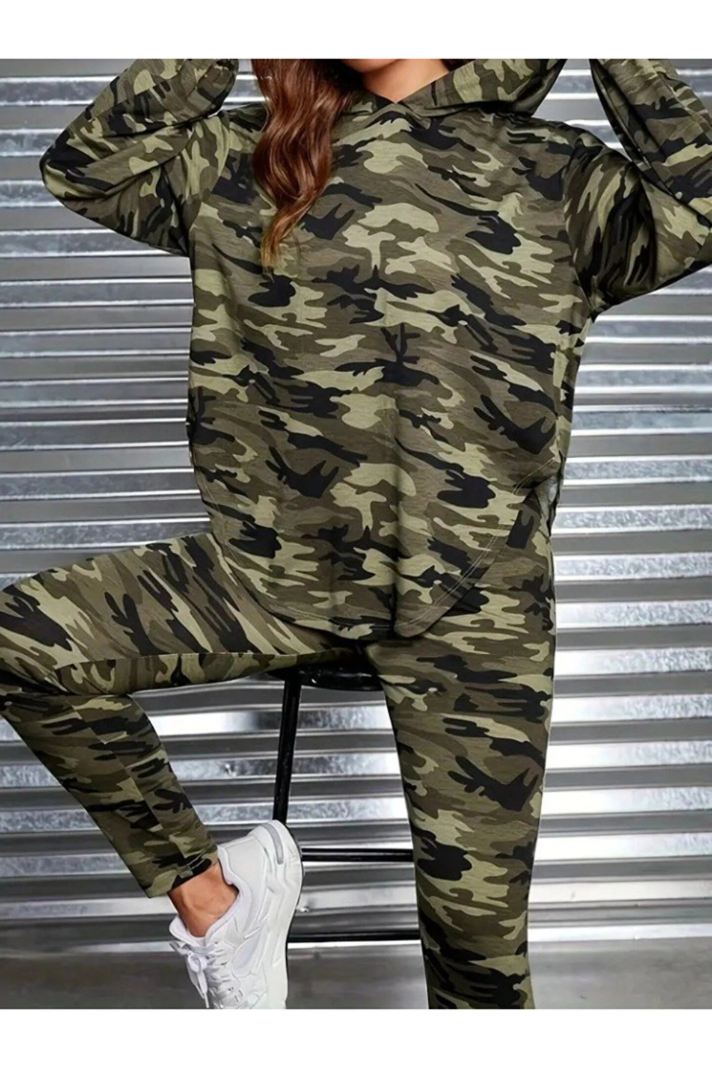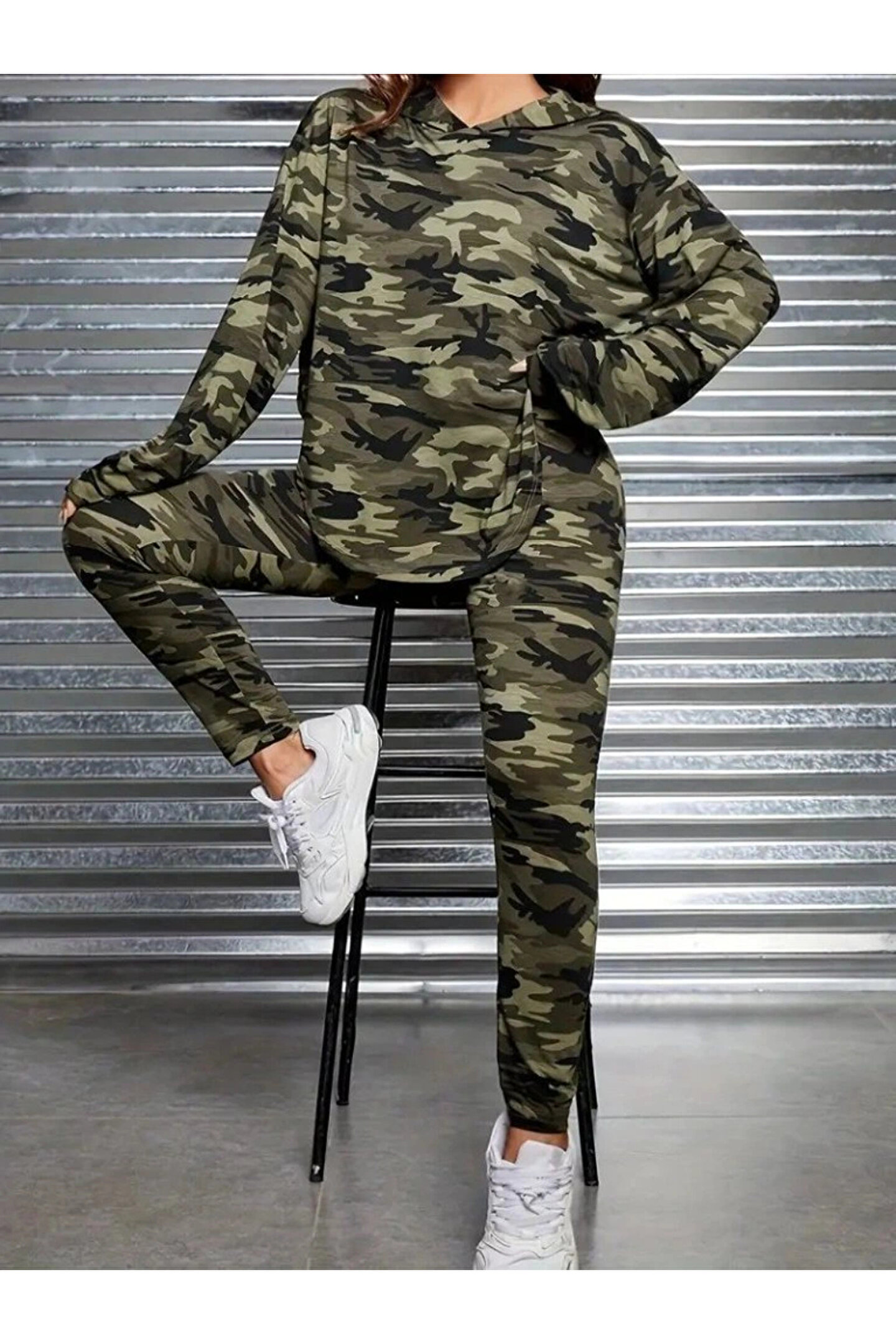 Kadın Uzun Kollu Kapşonlu Kamuflaj Desenli Bluz Ve Pantolon Tayt Ikili Takım