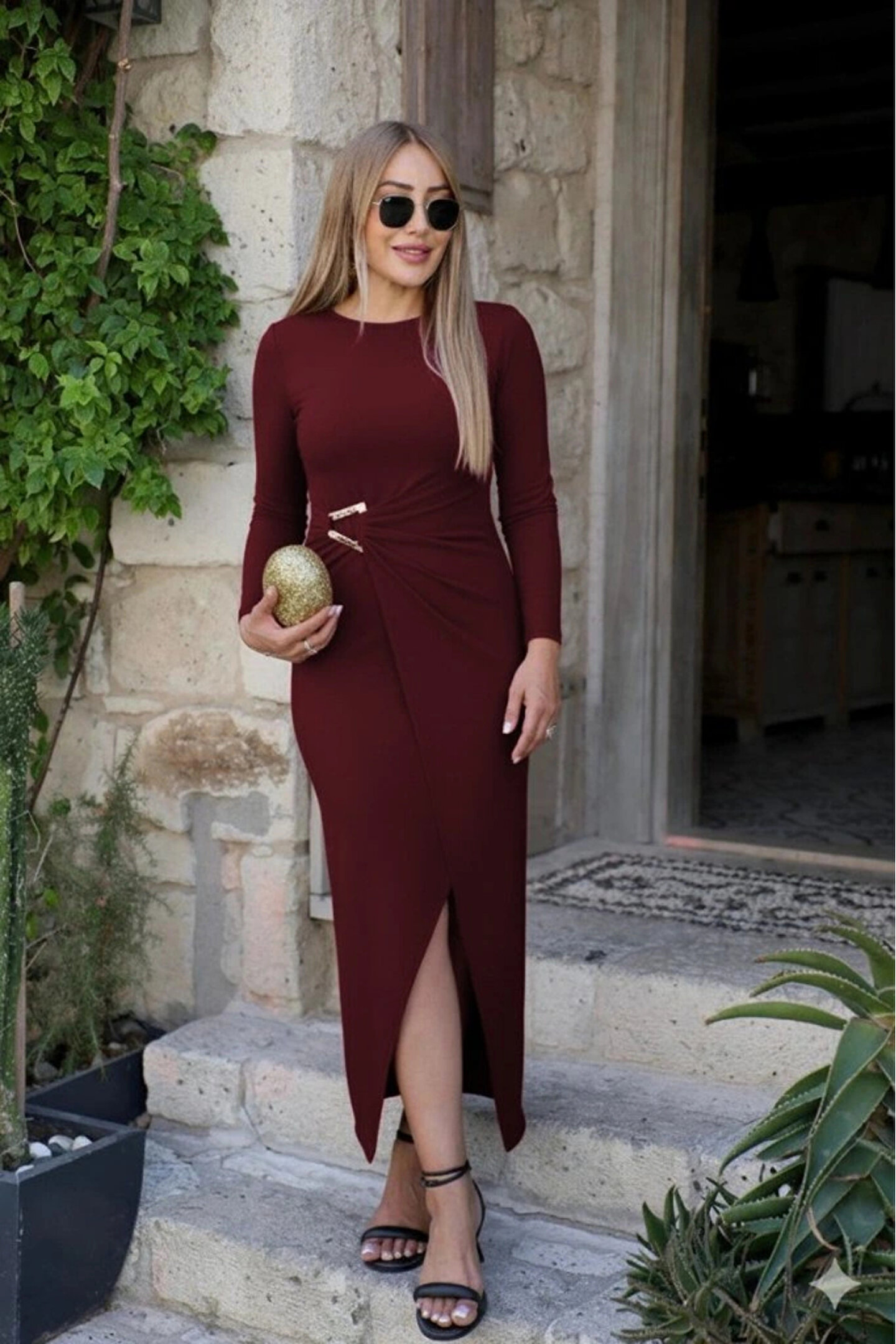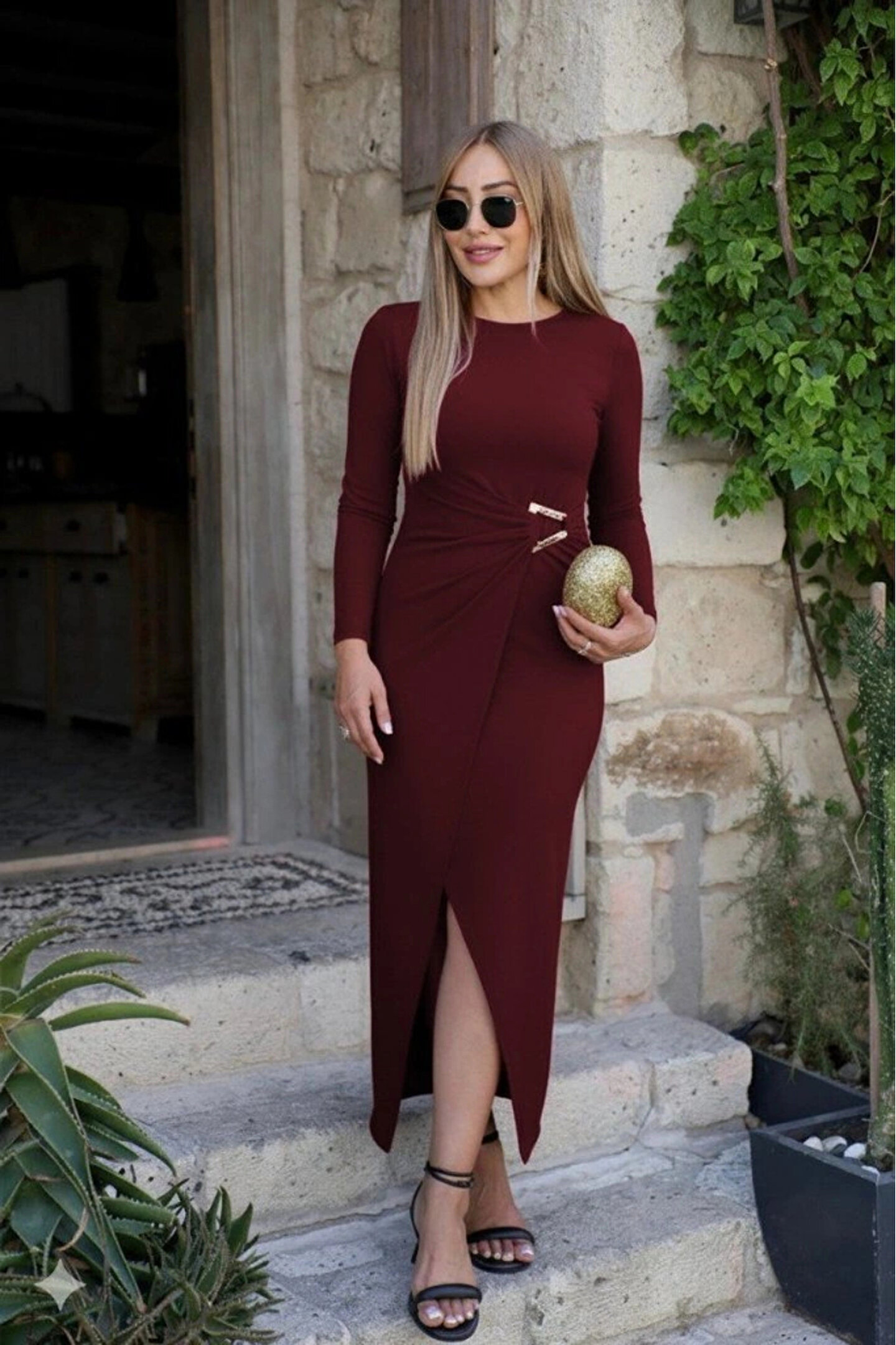 By Sevilen Collection Kadın Uzun Kollu önden çapraz Detaylı Yandan Toka Detaylı Uzun Sandy Elbise