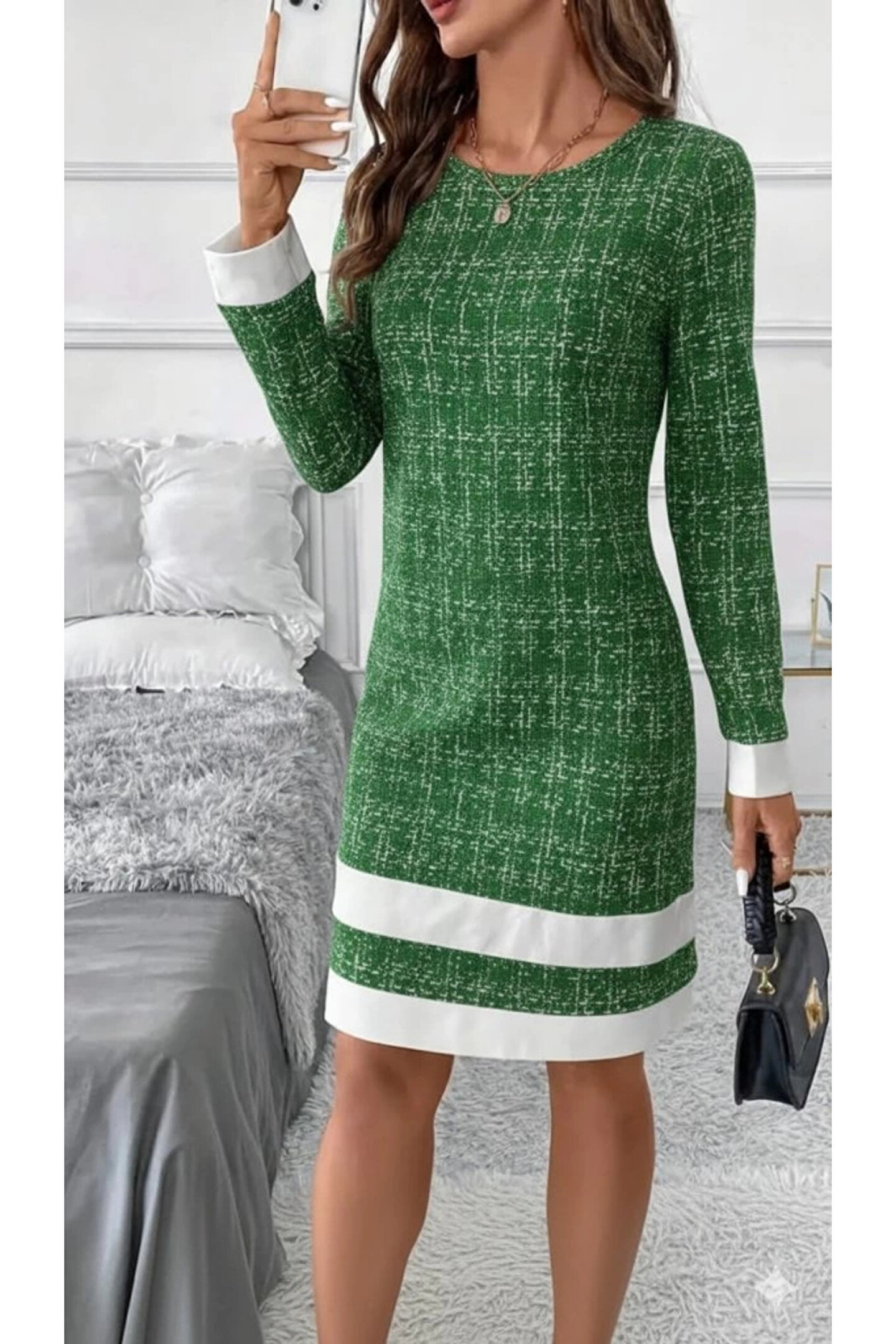 Kadın Uzun Kollu Yuvarlak Yaka Etek Ucu şerit Detaylı Mini Dokuma Elbise