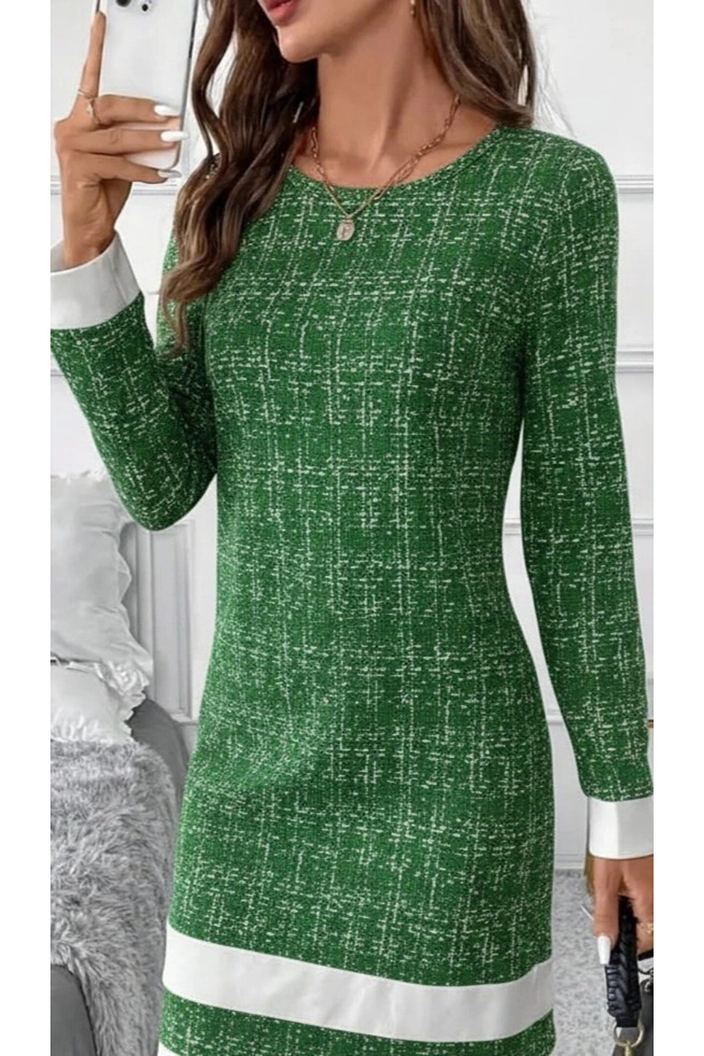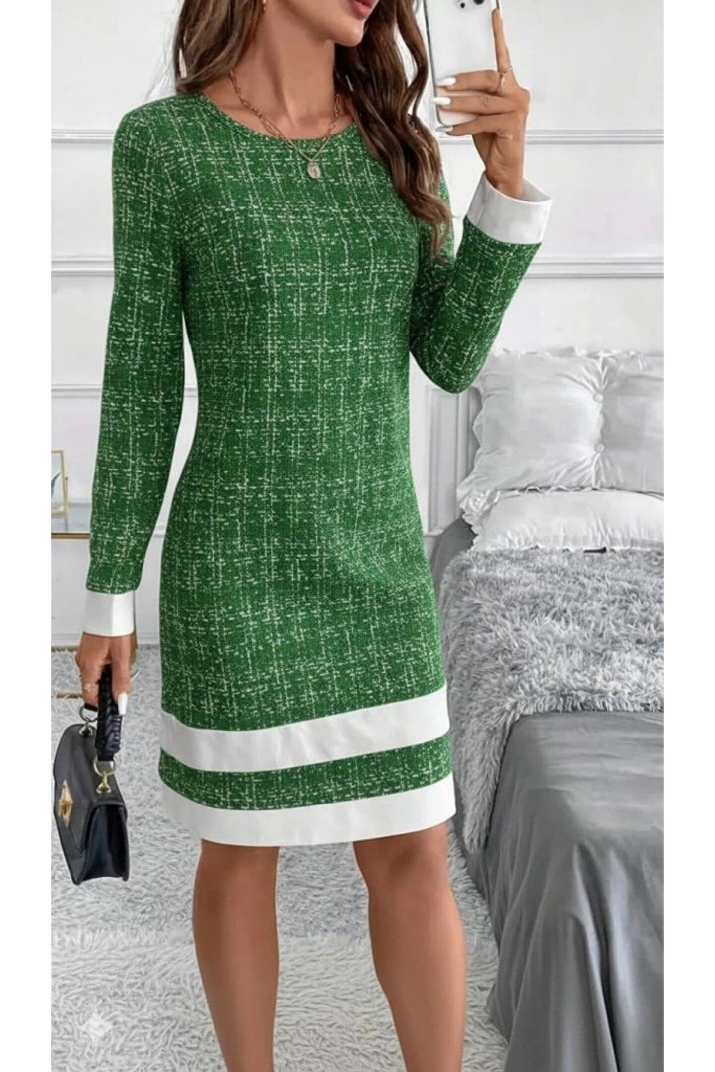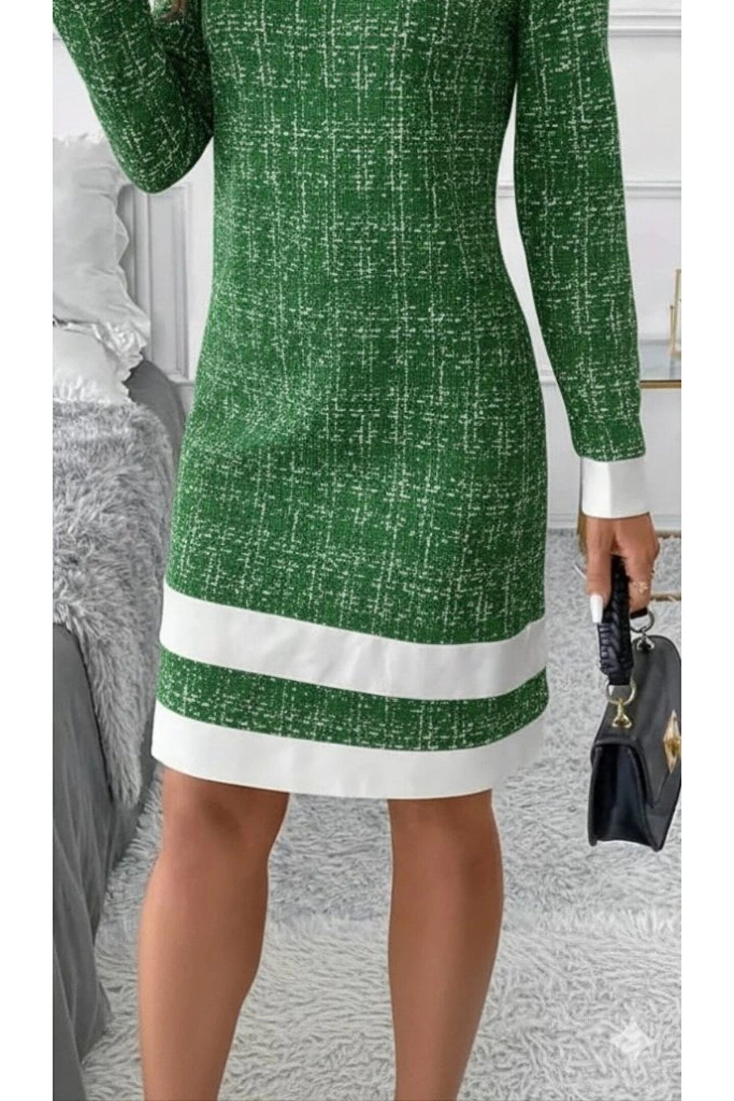 Kadın Uzun Kollu Yuvarlak Yaka Etek Ucu şerit Detaylı Mini Dokuma Elbise